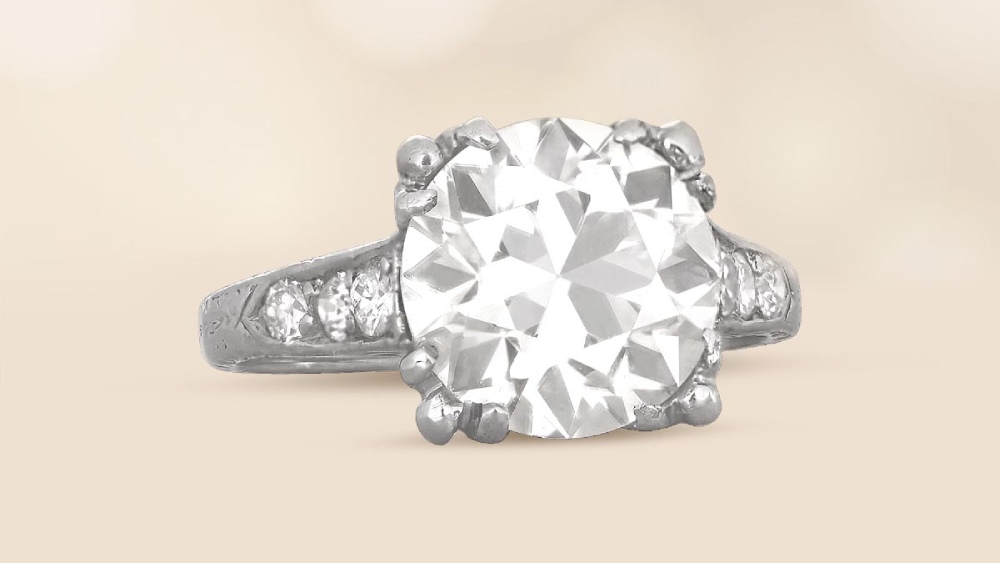 The stand-out aspect of this ring is the ornate setting, featuring diamonds and fine milgrain-adorned bow motif embellishments. The stunning setting may be quite eye-catching, but let’s not forget the gorgeous center diamond! The precious old European-cut center stone weighs 2.88 carats and is graded K for color and VS1 for clarity.