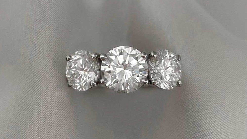 Another three-stone option, this is a suitable alternative for those wanting a more subtle and clean design. The 1.50-carat center diamond is I color and VVS1 clarity, while the side diamonds total 2.04 carats with H color and VS1-VS2 clarity overall. The brilliant diamonds are are prong-set. Finally, the piece is platinum and its authenticity is assured by a Graff signature.