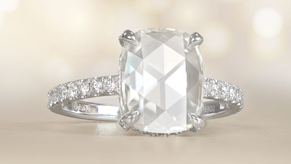 For a stunning solitaire piece, the Seymour Ring is an excellent choice. This lovely ring features a rose cut diamond GIA-certified as 2.16 carats with H color and VS2 clarity. The four prominent prongs securely hold the stone, while additional diamonds line them and continue around the gallery rail. Finally, even more diamonds adorn the shank and bring the total diamond weight to 2.69 carats.