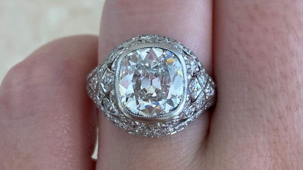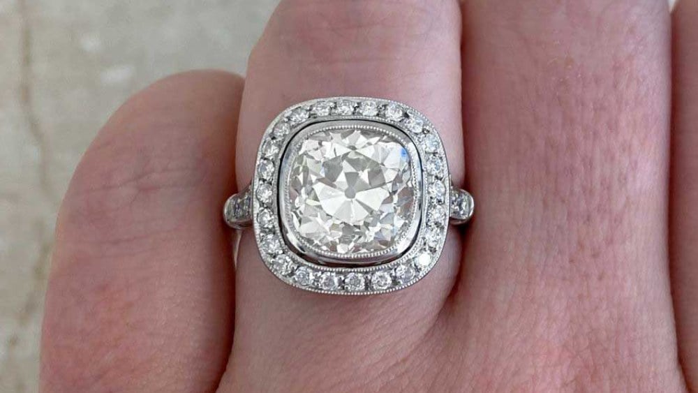 The magnificent centerpiece is an exquisite old mine cushion-cut diamond, weighing approximately 3.25 carats, with K color and VS2 clarity grades. What’s more, the center stone is surrounded by a staggering 3.66-carat halo of old mine-cut diamonds, which enhance its brilliance and add an air of luxury.