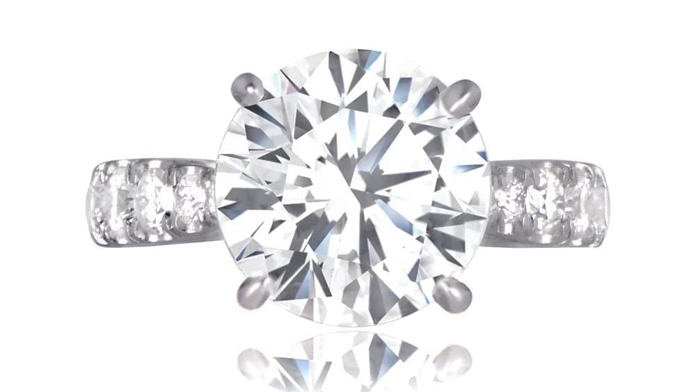 This gorgeous ring has an unassuming design, but still shines bright. The center 4.02-carat round brilliant-cut diamond is set in four prongs on a 14k gold mounting. Additionally, pave-set diamonds run along the shoulders, to the bottom of the ring. Finally, the secure setting is minimal, allowing the diamond to be admired from all angles.