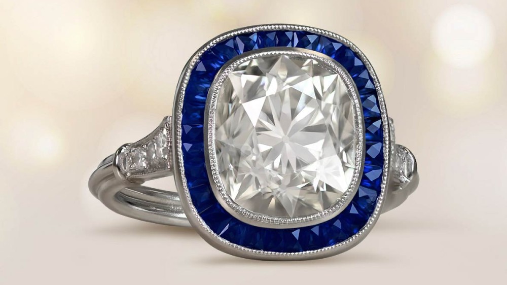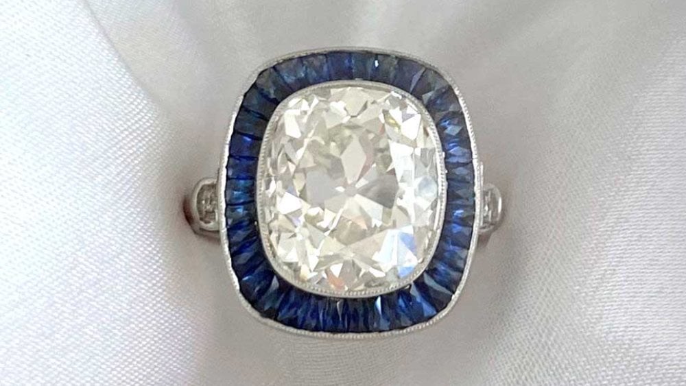 If you’re interested in a sapphire halo, then the Robinson Ring’s unobstructed design may interest you. The straightforward design features a large bezel-set 4.06-carat antique cushion-cut diamond and a surrounding 1.00-carat halo of French-cut natural sapphires. What’s more, an additional 0.12 carats of diamonds adorn the shoulders.