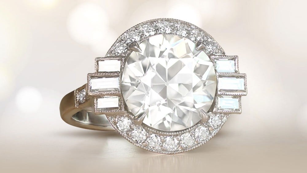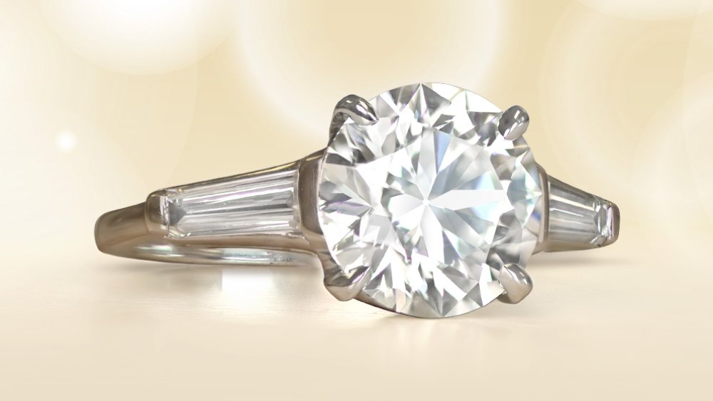 If you’re seeking the timeless beauty of a vintage engagement ring, then take a look at the stunning Osborne Ring. Handcrafted in platinum circa 1960, this piece features a GIA-certified round brilliant center diamond weighing 3.04 carats and boasting exceptional I color and SI2 clarity grades. Finally, approximately 0.72 carats of tapered baguette-cut diamonds adorn the shoulders.
