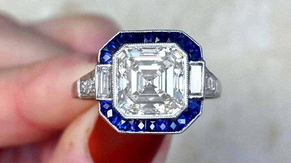 The impressive Emerson Ring is a true masterpiece, featuring a stunning 3.15-carat old European-cut center diamond, flanked by a row of channel-set baguette-cut diamonds on either side. The geometric mounting is handcrafted in platinum and bears French hallmarks, showcasing the ring’s exceptional quality and craftsmanship.