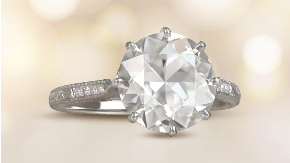 If you want a ring that is equally delicate and adorned, then check out the Ellenburg Ring. This precious treasure features a stunning 2.11-carat old European-cut center diamond certified by the GIA as having impressive D color and VS2 clarity. Finally, micro-pavé round brilliant-cut diamonds line the dainty shank and gallery.