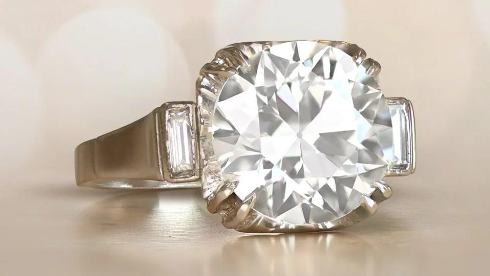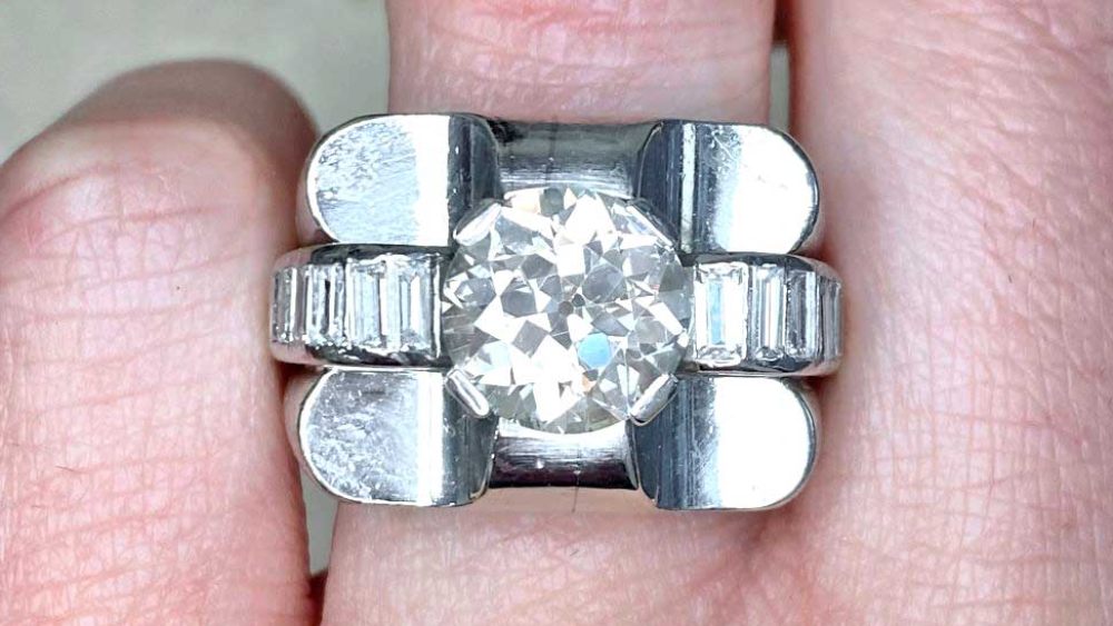Finally, this vintage French ring was made circa 1945, during the Retro Era, and has a total diamond weight of approximately 4.15 carats.