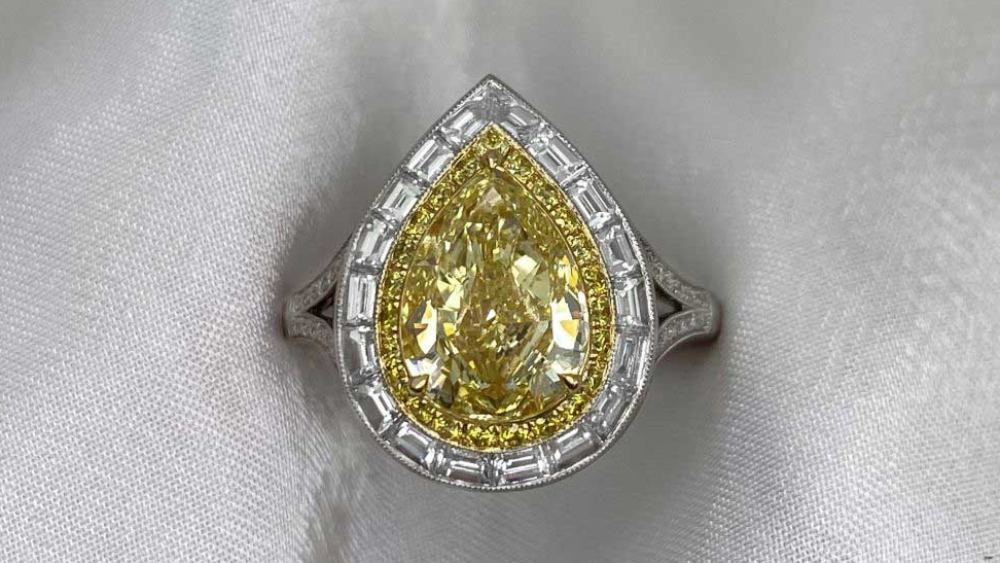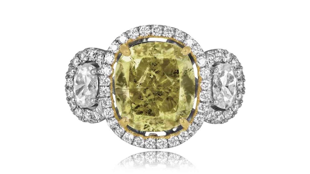 The Dunavant Ring features a 4.01-carat cushion-cut fancy yellow diamond held in four claw prongs and surrounded by a halo of round diamonds. Each of the large shoulders are embelished by an oval accent diamond within a diamond halo.