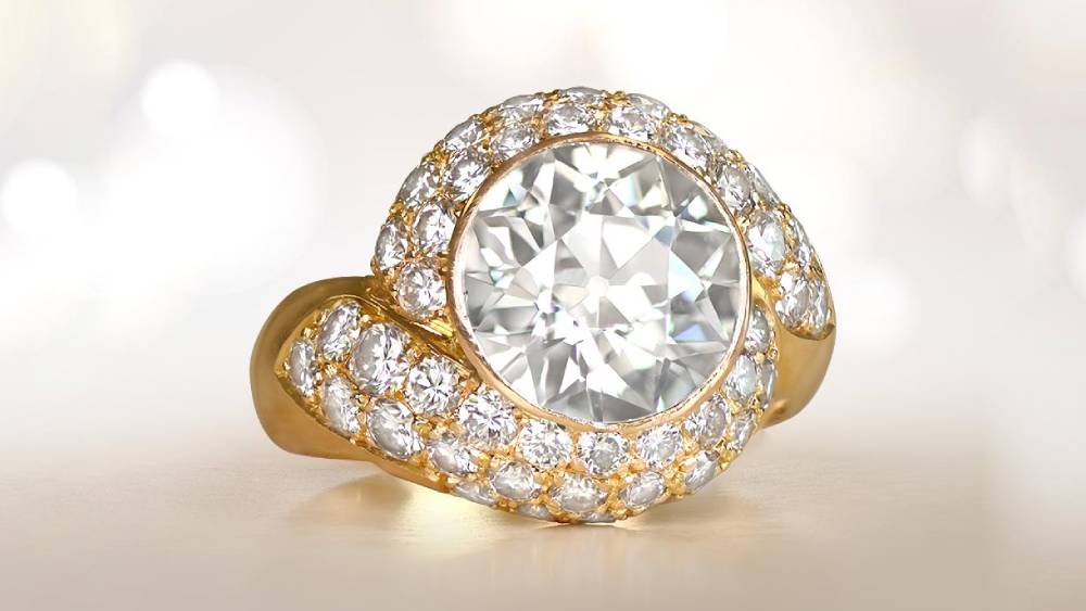 Starting off our list is the exquisite Gifford Ring. This spectacular ring features a GIA-certified 3.00-carat center diamond with K color and SI1 clarity. What truly makes this ring stand out are the swirling shoulders set with 2.80 carats of additional diamonds, which continue along the bridge. Finally, this yellow-gold piece was handcrafted in France circa 1970.