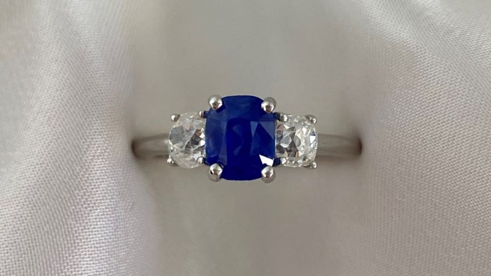 Although less common today, sapphire engagementment rings are more conventional than you might think- steeped in tradition and historical significance. The three-stone Lorneville features a 1.59-carat center sapphire accompanied by an old European cut diamond on each side. The stones are each held in four prongs, and the mounting is platinum.