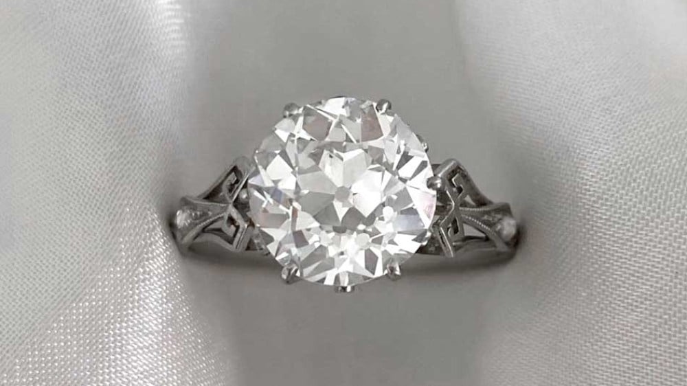 The Art Deco beauty features shoulders and a high crown with mesmerizing openwork, while the platinum shank is plain. Handcrafted circa 1925, the Rockland Ring displays a 3.08-carat Old European center diamond, GIA-certified as J color and VS1 clarity.