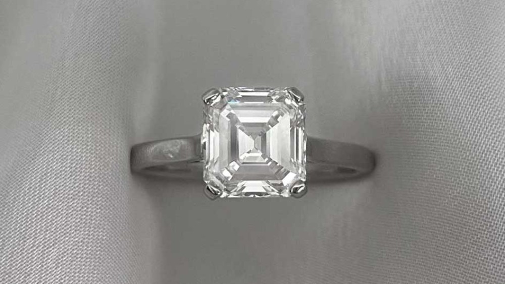 There’s no questioning the elegance and beauty of the Deansgate Ring. The majestic emerald-cut center diamond is 3.14 carats and holds exceptions I color and VS2 clarity grades. In addition, a bullet-shaped diamond flanks each side of the center stone, emphasizing it. The ring is made of platinum and the additional diamond weight is approximately 0.80 carats.