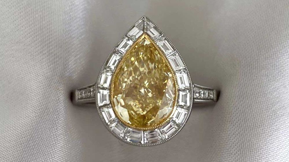 The pear-shaped fancy yellow diamond centering this stunning piece is certainly an eye-catcher. The 2.75-carat stone is enveloped by a double-halo of yellow and white baguette-cut diamonds, while additional white diamonds adorn the split shoulders. For a unique ring with incredible energy. you can’t go wrong with the Zamara Ring.