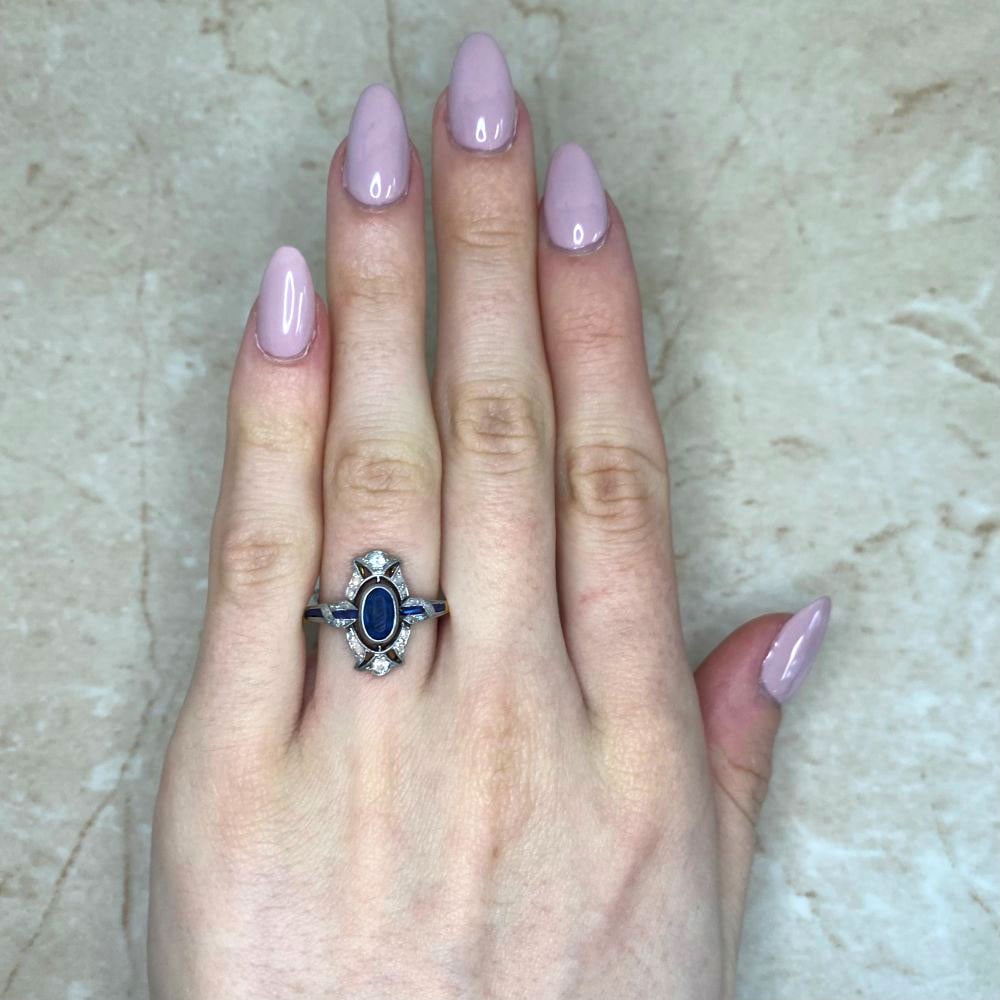 The ring turned out beyond stunningly gorgeous; my fiancée & I are mesmerized in gazing at it, what seems like constantly. The Sapphire stone is beautifully set amongst several baguettes of diamonds that catch our eyes every time we glance at it.