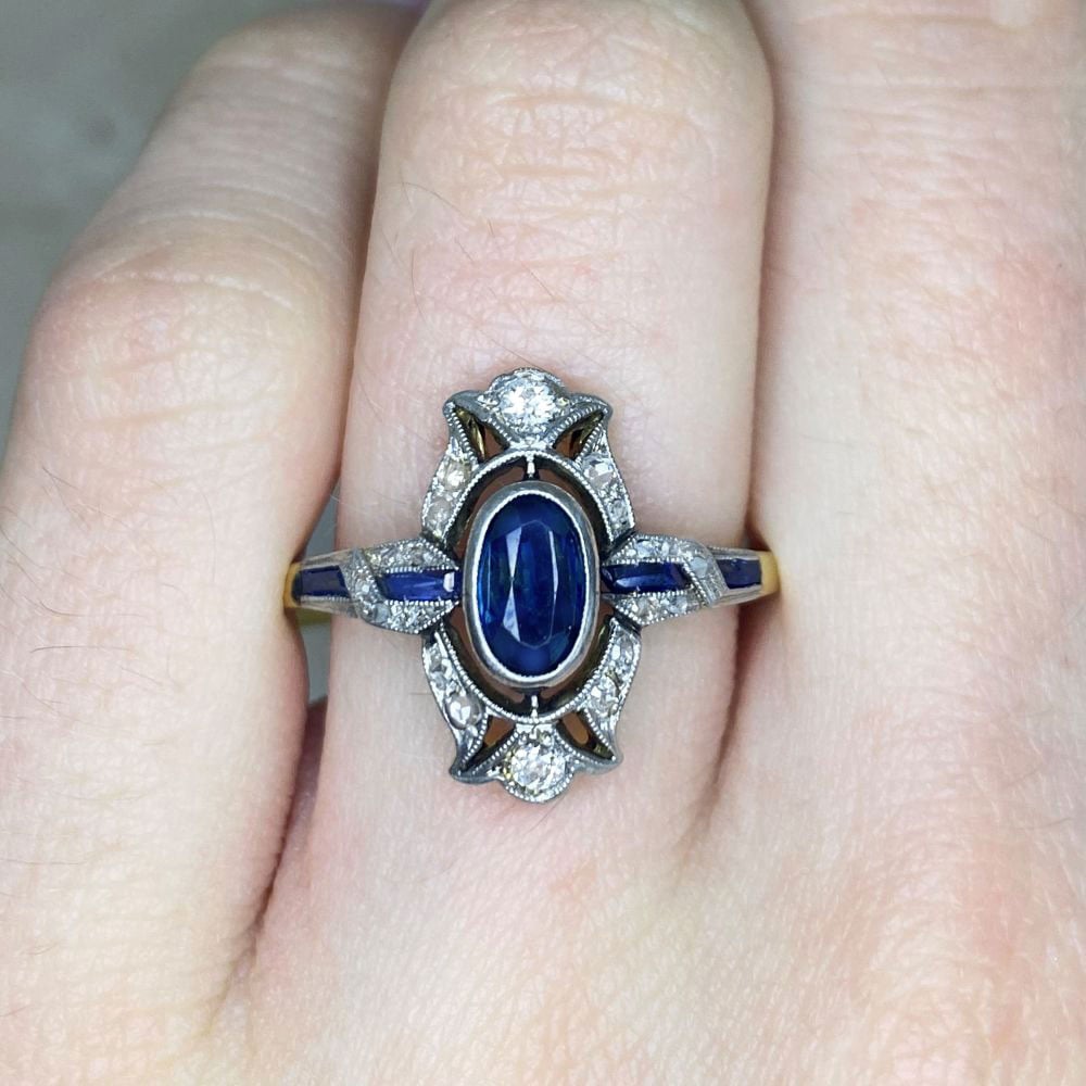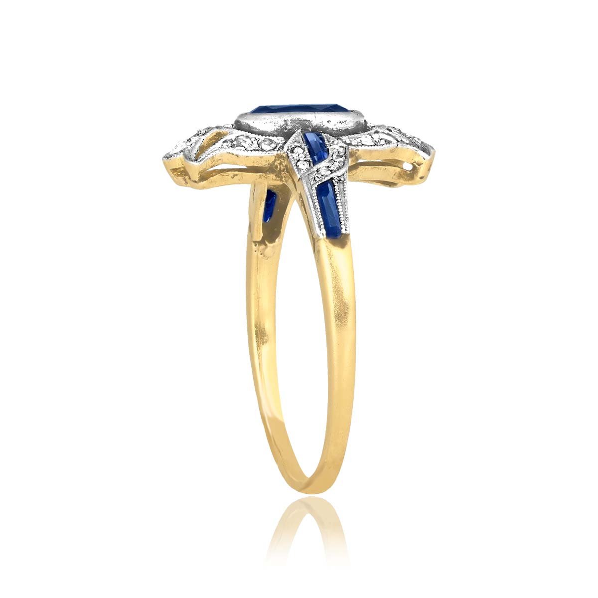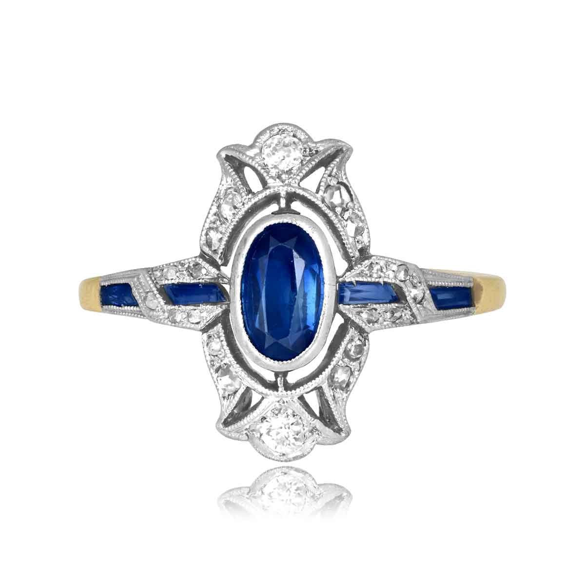 This Edwardian era ring centers an oval cut sapphire stone set in a bezel setting. Surrounding the sapphire stone is a filigree design adorned with diamond and sapphire stones. This ring was handcrafted in platinum on 18k yellow gold.
