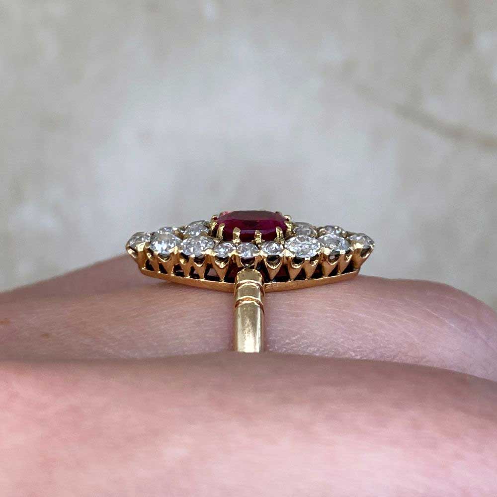 A Victorian era navette ring featuring a oval cut Burma no-heat GIA certified center ruby weighing 0.64 carats. surrounding the center stone are old cut diamonds sent in a shared prong setting. The diamonds weigh a total of 1.12 carats. The shoulders are decorated with grooved detailing. This ring was handcrafted in 14k yellow gold, circa 1880.