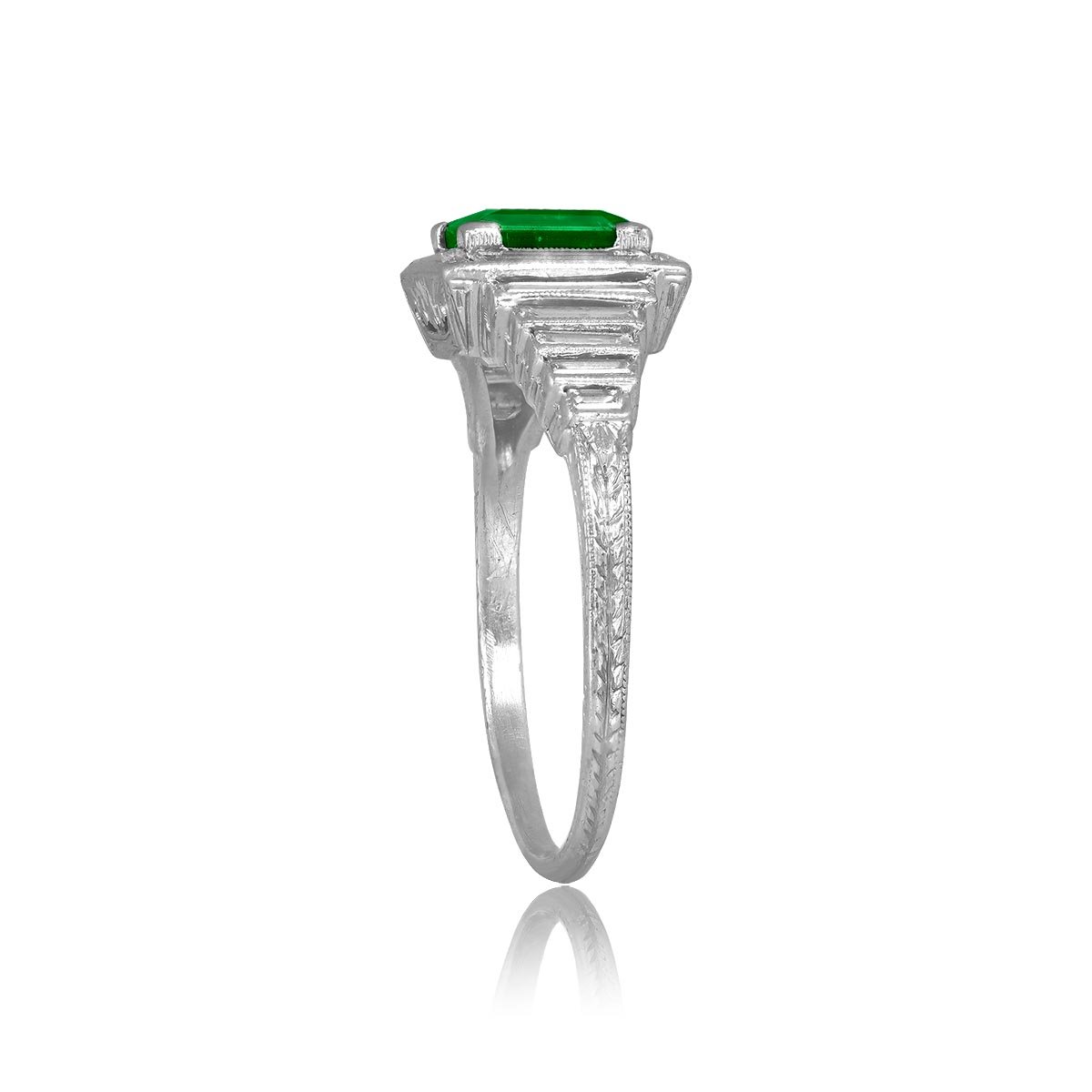 A stunning Art Deco ring featuring a 0.77 carat square emerald center stone set in a square-prong setting. Surrounding the center stone is a halo of elongated baguette shaped diamonds with a French cut diamond on each corner. The shoulders showcase a tapered pattern with additional baguette diamonds leading to an engraved shank. This ring is made in platinum, circa 1920.