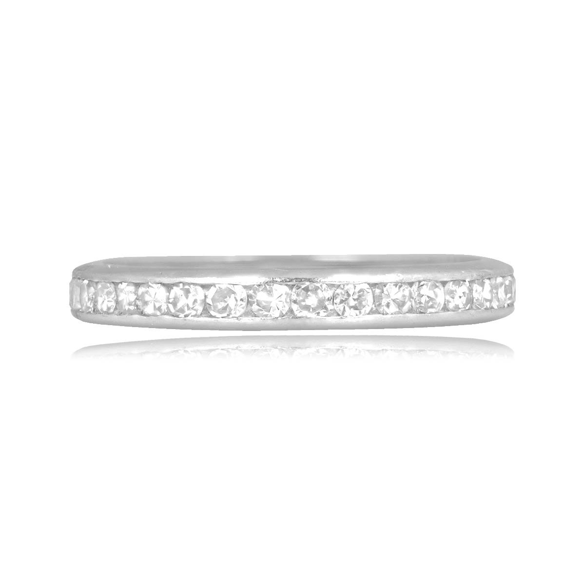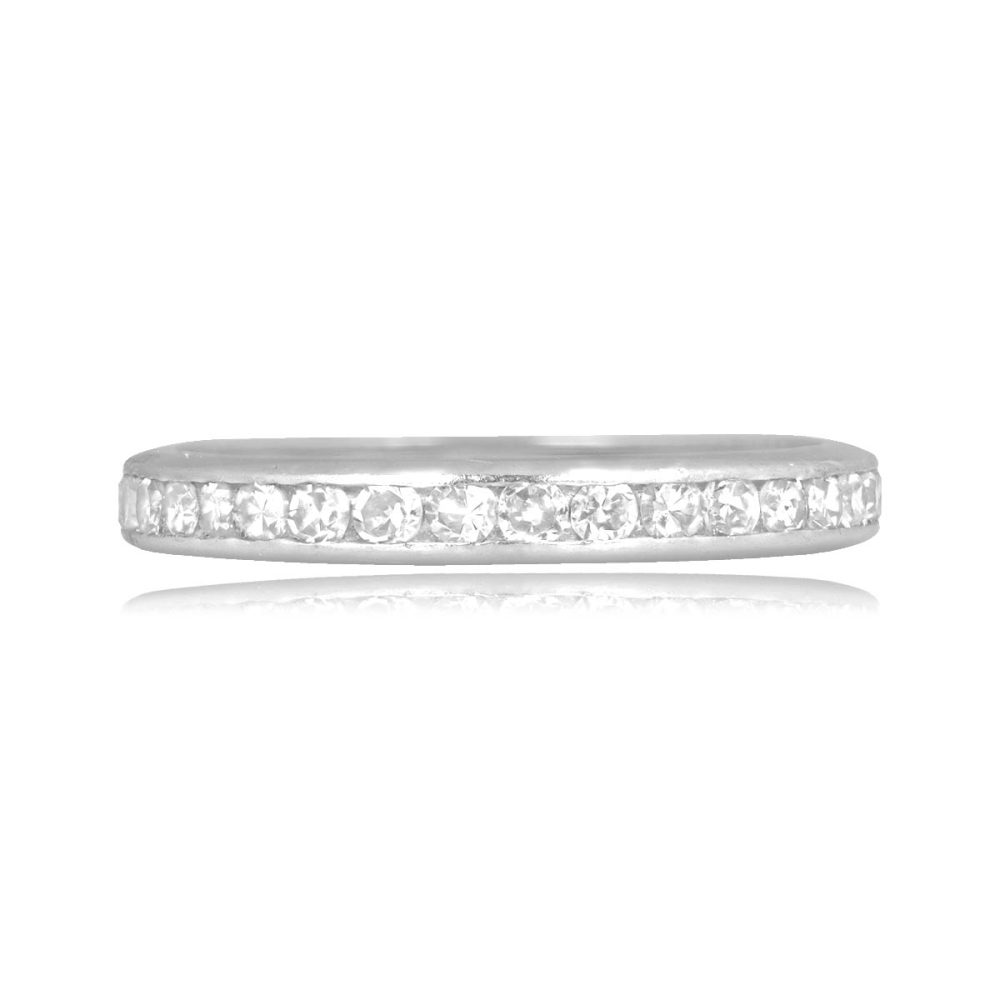A vintage eternity wedding band featuring round diamonds set in a channel setting. The diamonds weigh a total of approximately 0.68 carats. This band was made in platinum, circa 1950.