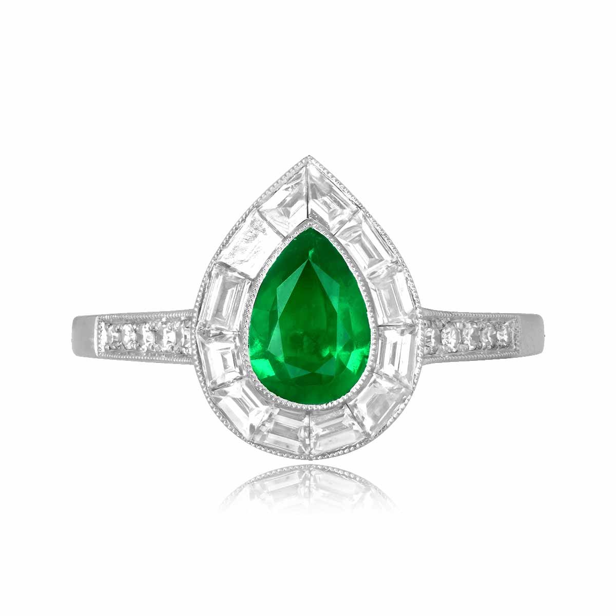 This ring centers a 0.47 carat pear shaped emerald stone set in a bezel setting. Surrounding the emerald is a halo of baguette cut diamonds weighing a total of 0.48 carats. The shoulders are decorated with additional diamonds and milgrain detailing. The under-gallery of this ring features an openwork design. This ring is made in platinum.