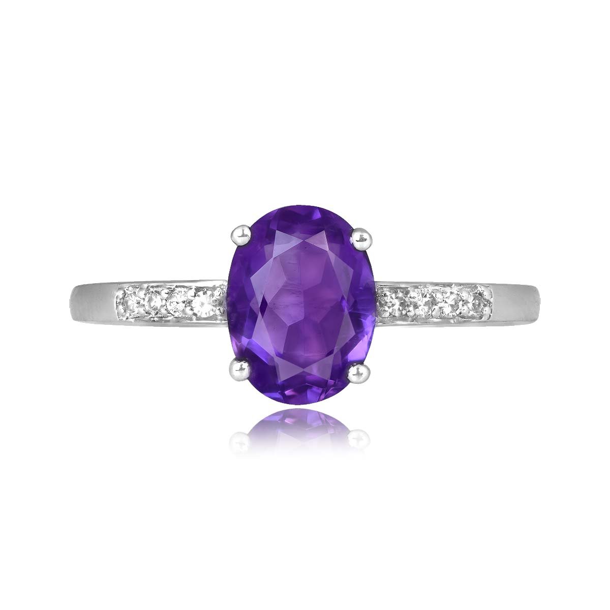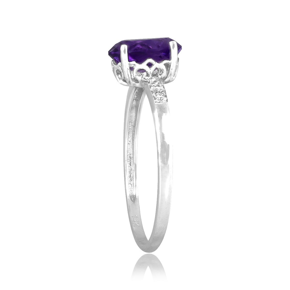 This ring feature a 1.32 carat oval cut amethyst center stone set in prongs. The under-gallery is decorated with openwork designs. Diamonds are pave-set along the shoulders of the ring. This ring is made in 14k white gold.