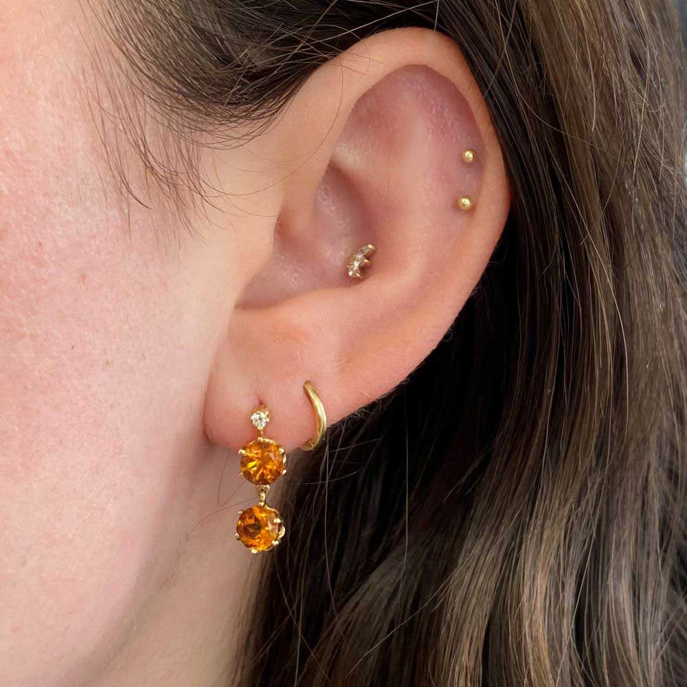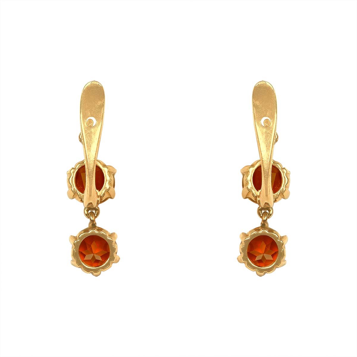 A stunning pair of Victorian earrings showcasing two round citrine stones on each earring set in six prong settings. The top section of each earring features an Old European cut diamond. The total approximate citrine weight is 2.52 carats and the total approximate diamond weight is 0.05 carats. These earrings were handcrafted in 14k yellow gold, circa 1880.