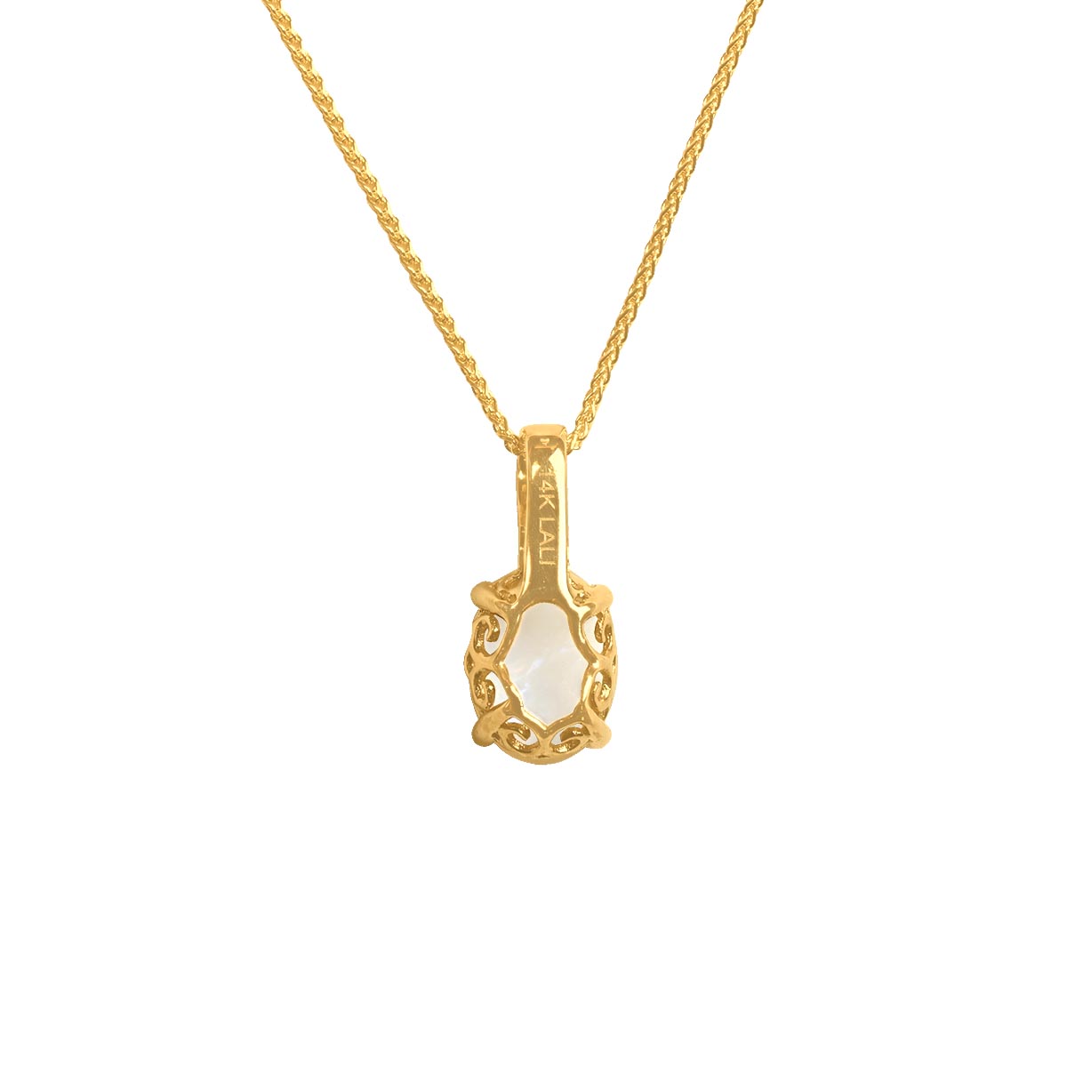 This necklace features an oval cut 0.79 carat opal pendant. The opal is set in a prong setting with open work detailing on the mounting. The bail is decorated with pave-set diamonds. This necklace is made in 14k yellow gold.
