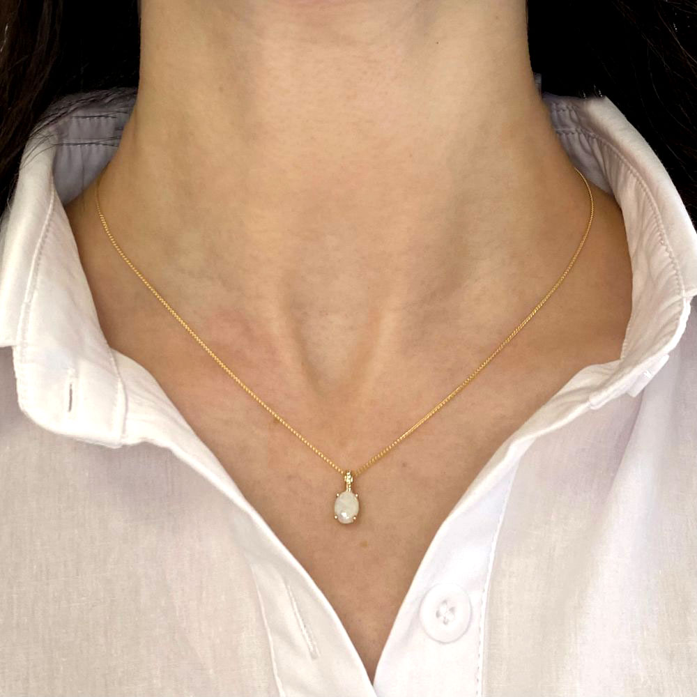 A Word from the Jeweler: The oval opal in this necklace is captivating with its shifting colors playing against the warmth of the yellow gold. The diamonds on the bail add just the right touch of brilliance, giving the opal an elegant frame.
