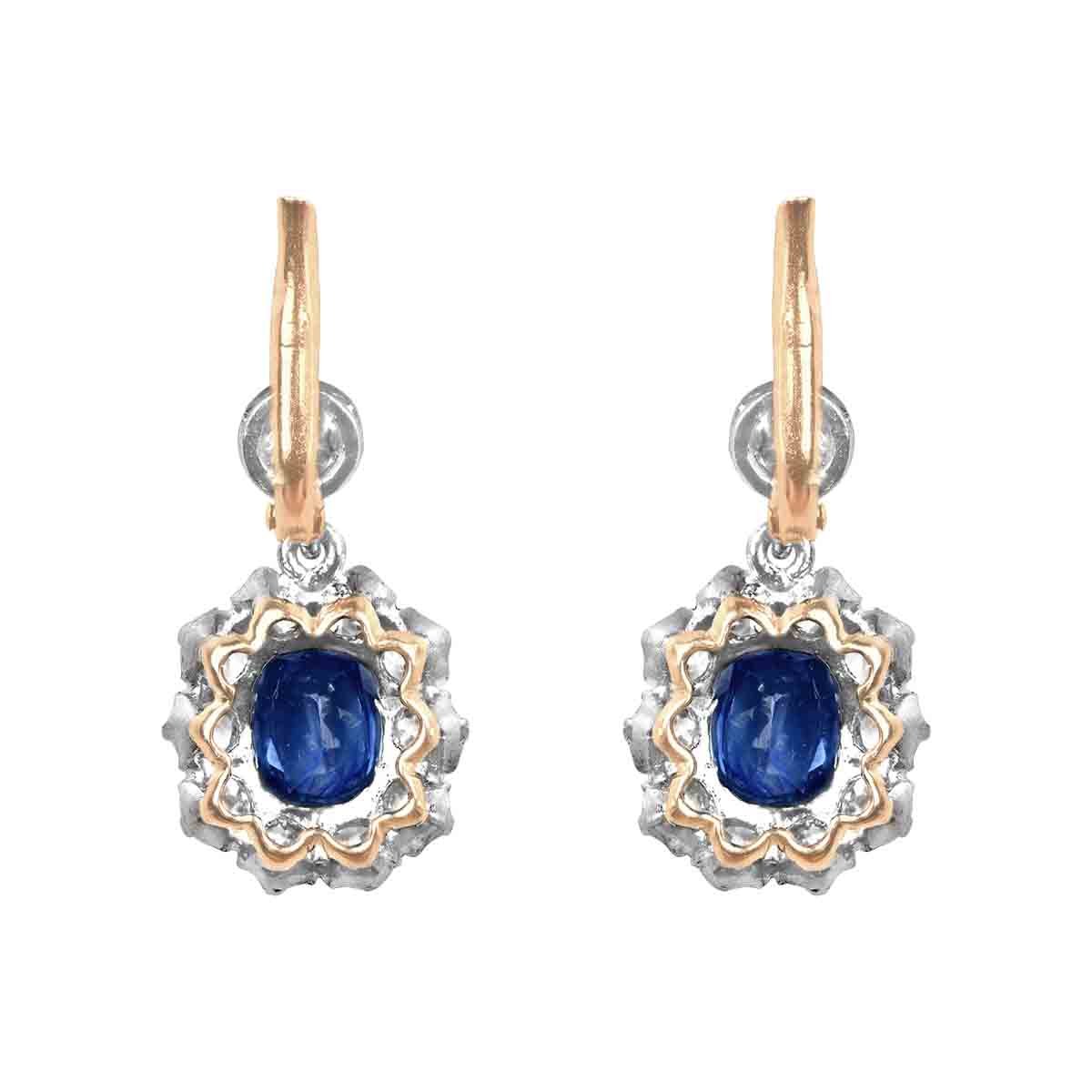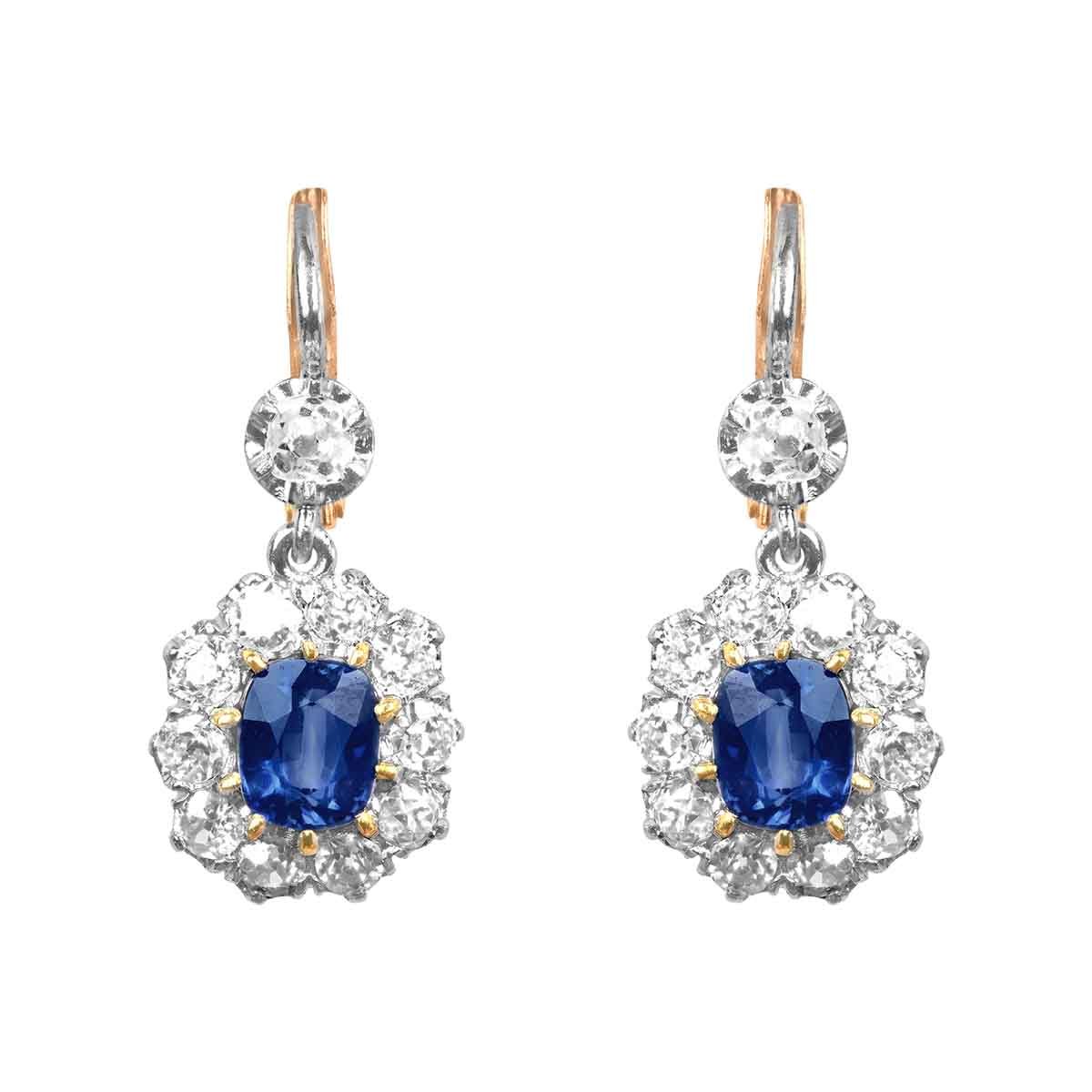 A beautiful pair of floral earrings centering two cushion cut sapphire stones set in prong settings. Surrounding the sapphire stones are clusters of old European cut diamonds. An additional diamond is set at the top section of each earring. The diamonds weigh a total of 1.75 carats and the sapphires weigh a total of 1.95 carts. These earrings are made in platinum and 18k yellow gold.