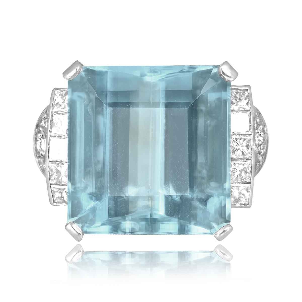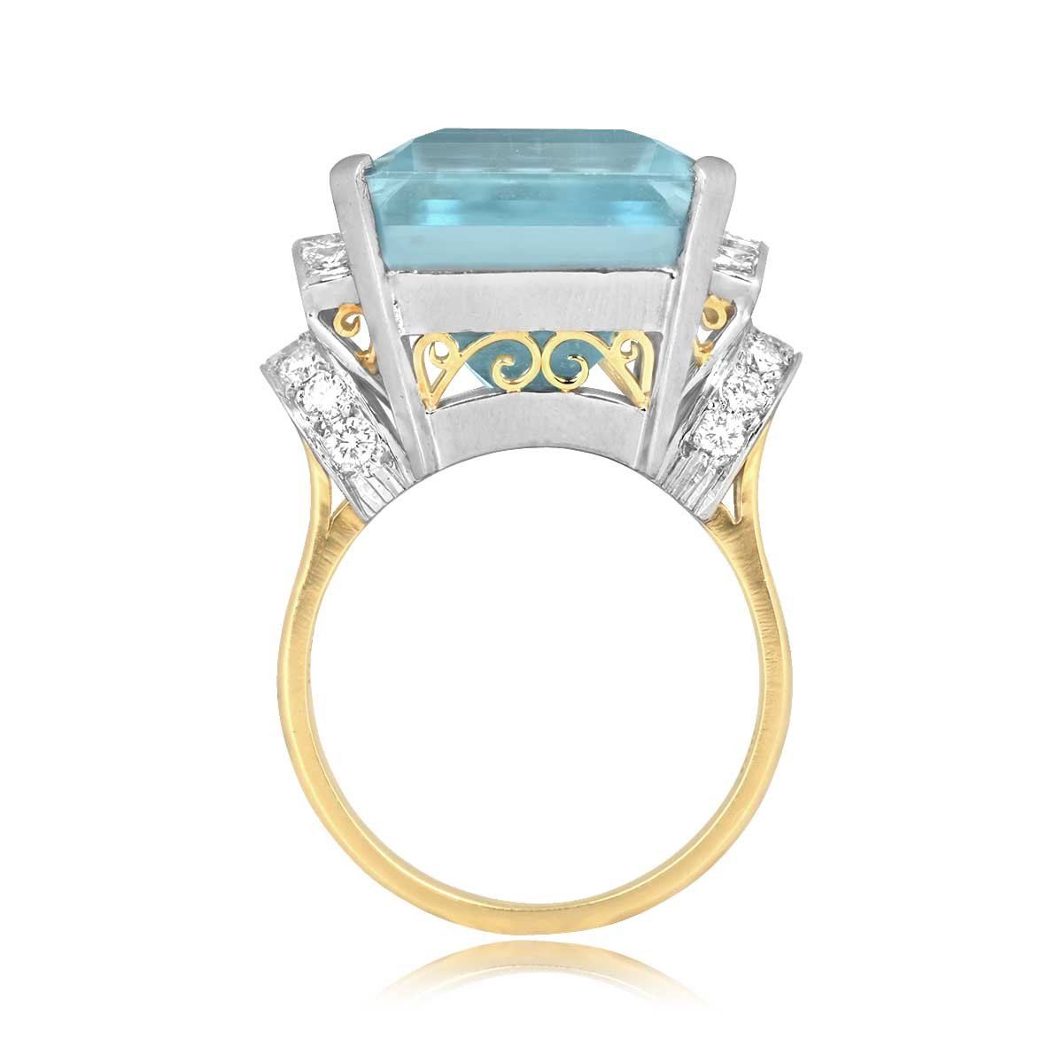 This stunning vintage ring centers a prong-set square emerald-cut aquamarine weighing approximately 18.00 carats. Rows of princes and round cut diamonds accent the aquamarine weighing a total of approximately 1.00 carat. The under-gallery of this ring is decorated with scroll motifs. This ring was handcrafted in platinum on 18k yellow gold, circa 1970.