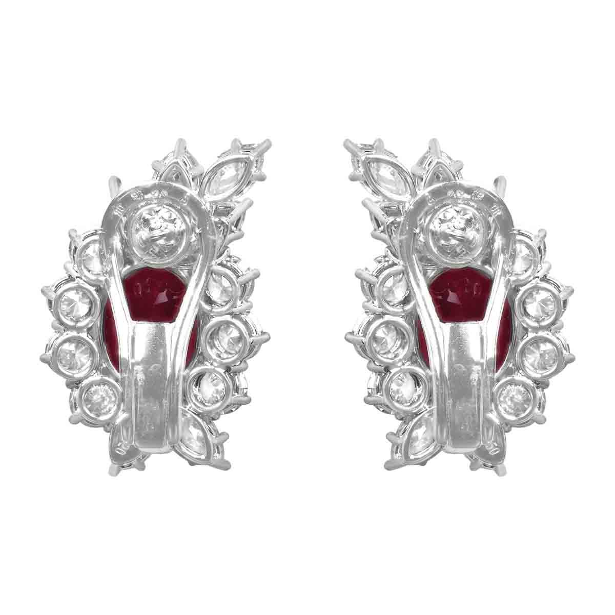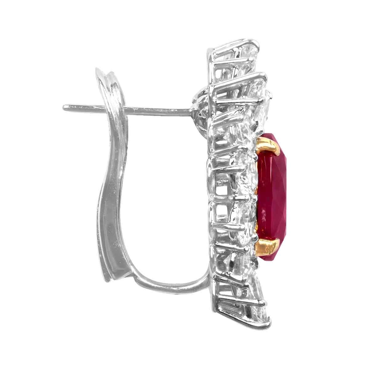 A stunning pair of earrings featuring two non-heated Burmese ruby stones weighing a total of 9.45 carats certified Gubelin. The rubies are set in 18k yellow gold prong settings. Surrounding the rubies are marquise and round cut diamond stones prong set in an intricate pattern. These earrings were made in platinum.