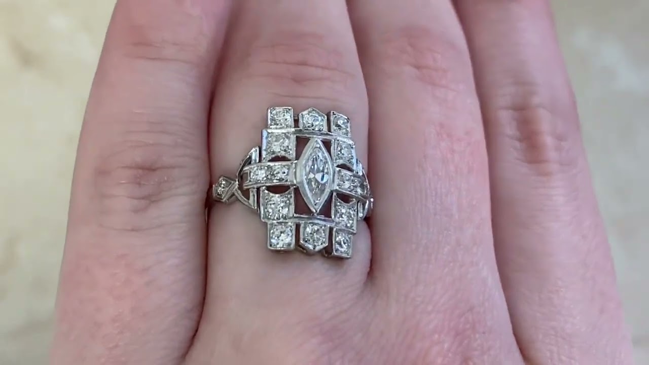 This antique diamond ring features a 0.30 carat marquise cut diamond center with I color and VS1 clarity. The center diamond is bordered by a geometric halo of old European cut diamonds, with one additional diamond flanking each shoulder. The approximate total weight for the additional diamonds is 0.95 carats, with I color and VS1 clarity overall. This ring was handcrafted in platinum during the Art Deco era, circa 1920.