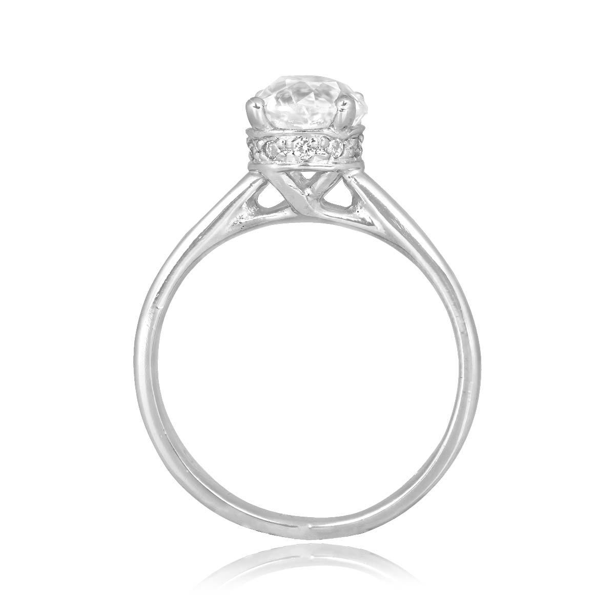 An antique Bailey Banks & Biddle ring centering a GIA certified 1.36 carat old mine cut diamond with an H color and SI2 clarity. A hidden halo of additional diamonds decorates the under-gallery of this ring weighing a total of approximately 0.14 carats. This ring was handcrafted in platinum and signed Bailey Banks & Biddle, circa 1930.