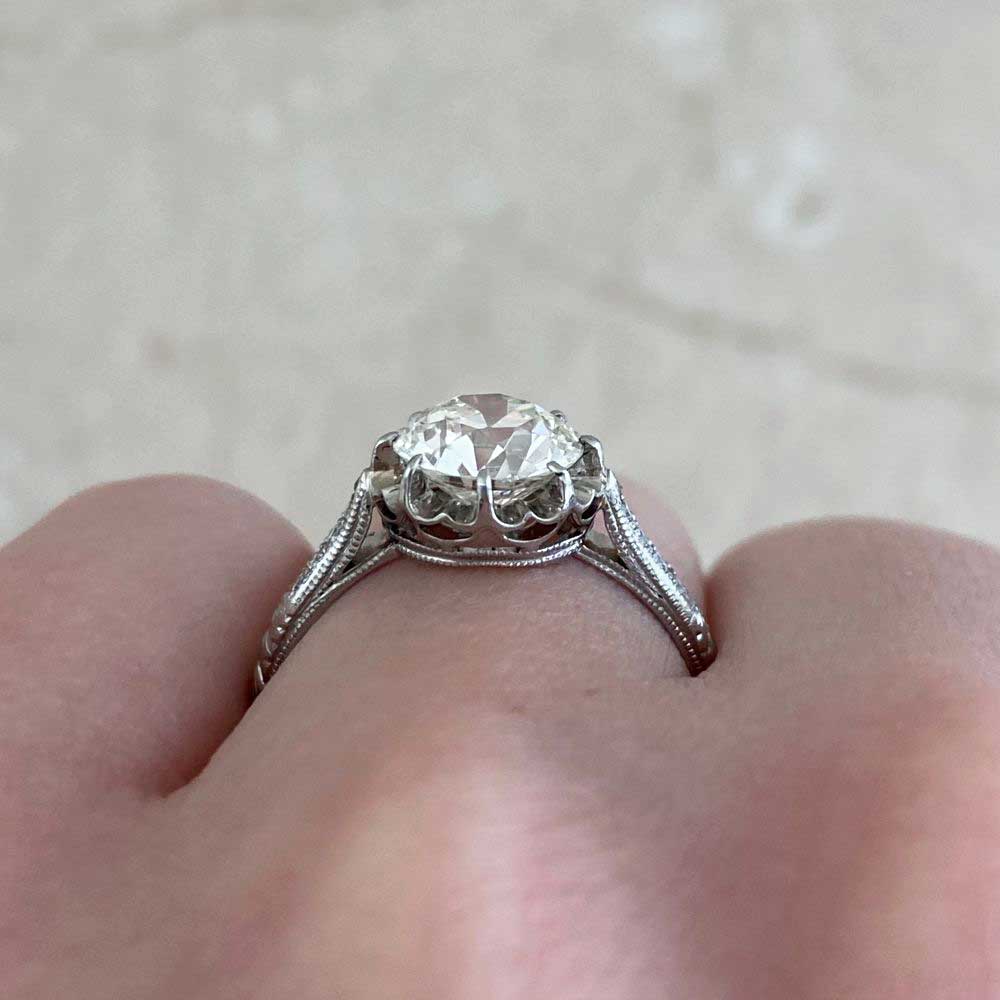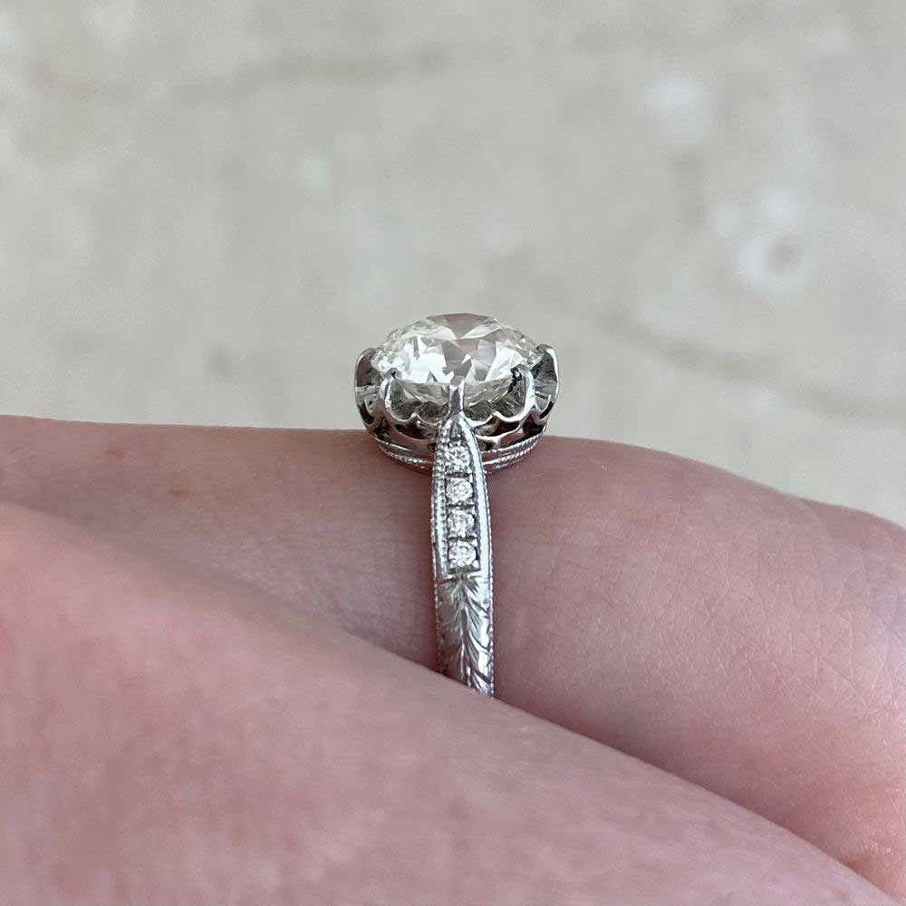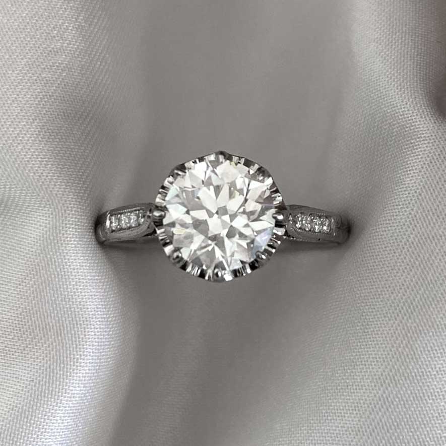A Word from the Jeweler: The engraving along the shank is crisp and thoughtfully done, something I always look for in an authentic Art Deco solitaire ring. I also appreciate how the shoulder diamonds subtly draw attention to the center stone without competing with it. The antique center old Euro in stunning, and really comes to life within the crown-style gallery.