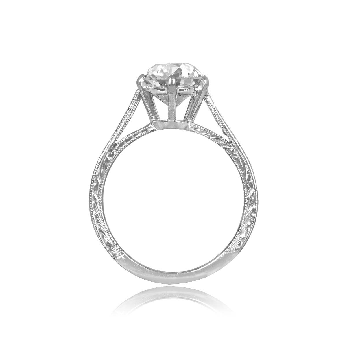 This beautiful Art Deco ring features a GIA certified old European cut diamond weighing 1.72 carats, K color, and VS2 clarity. Each shoulder is decorated with four pave-set round diamonds which leads to an intricately designed hand-engraved shank. This ring is platinum on 18k gold, and made in France. circa 1925