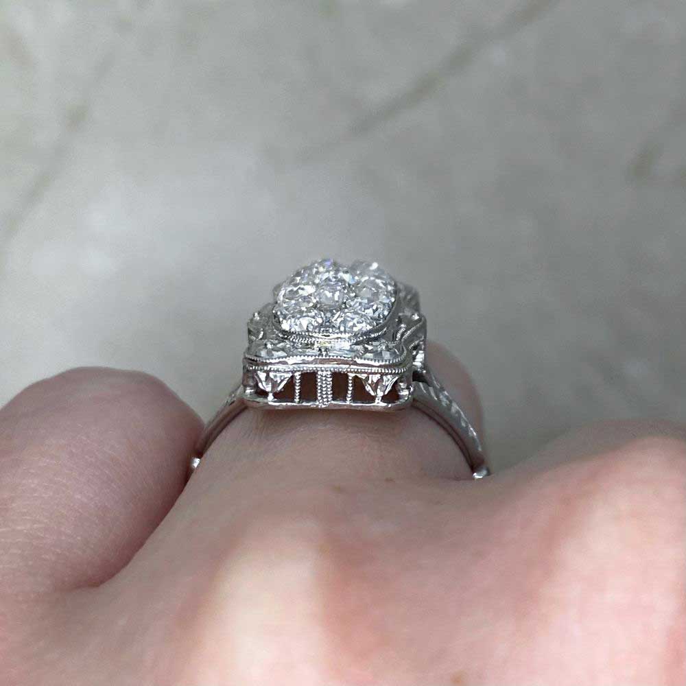 A Word from the Jeweler: The elongated layout combined with the old European diamonds gives this ring such a graceful flow. The filigree work is especially well done here; it’s clear a lot of care went into the details.