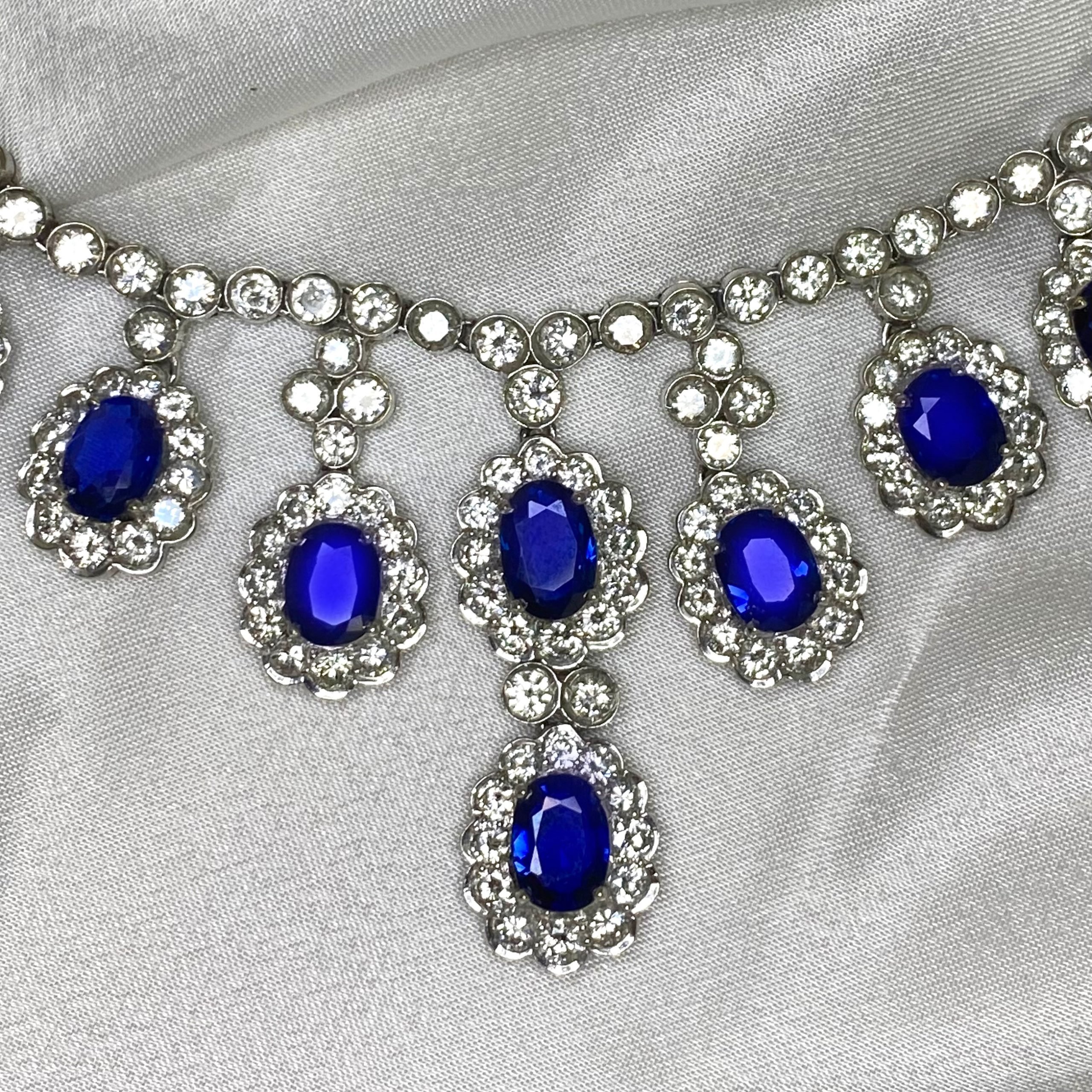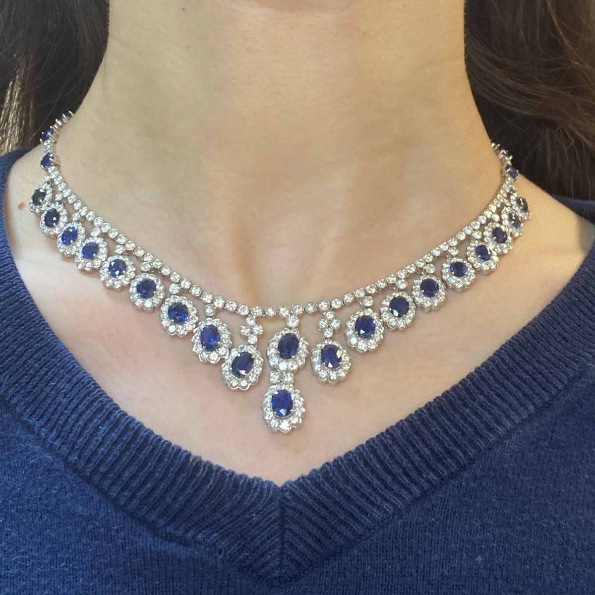 A stunning vintage necklace featuring sapphire and diamond stones. Cluster drops adorn the necklace centering oval cut sapphires surrounded by round diamonds. Additional sapphires and diamonds are set along the necklace. The sapphires weigh a total of approximately 10.00 carats and the diamonds weigh a total of approximately 18.00 carats. The two center sapphire stones weigh a total of approximately 3.00 carats. This necklace was made in 18k white gold.