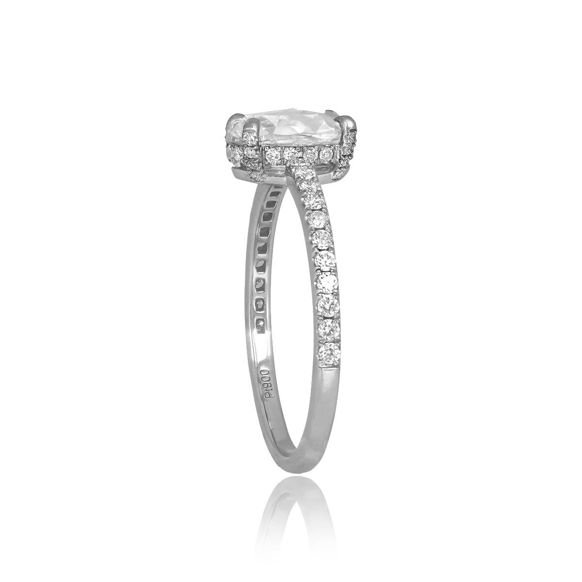 A diamond solitaire engagement ring featuring a GIA-certified 1.05 carat oval rose cut diamond, G color and VS2 clarity. The diamond is set in prongs, and accented by a round brilliant cut micro-pave basket and shoulders. The total weight of the additional diamonds is approximately 0.40 carats. This ring is handcrafted in platinum.