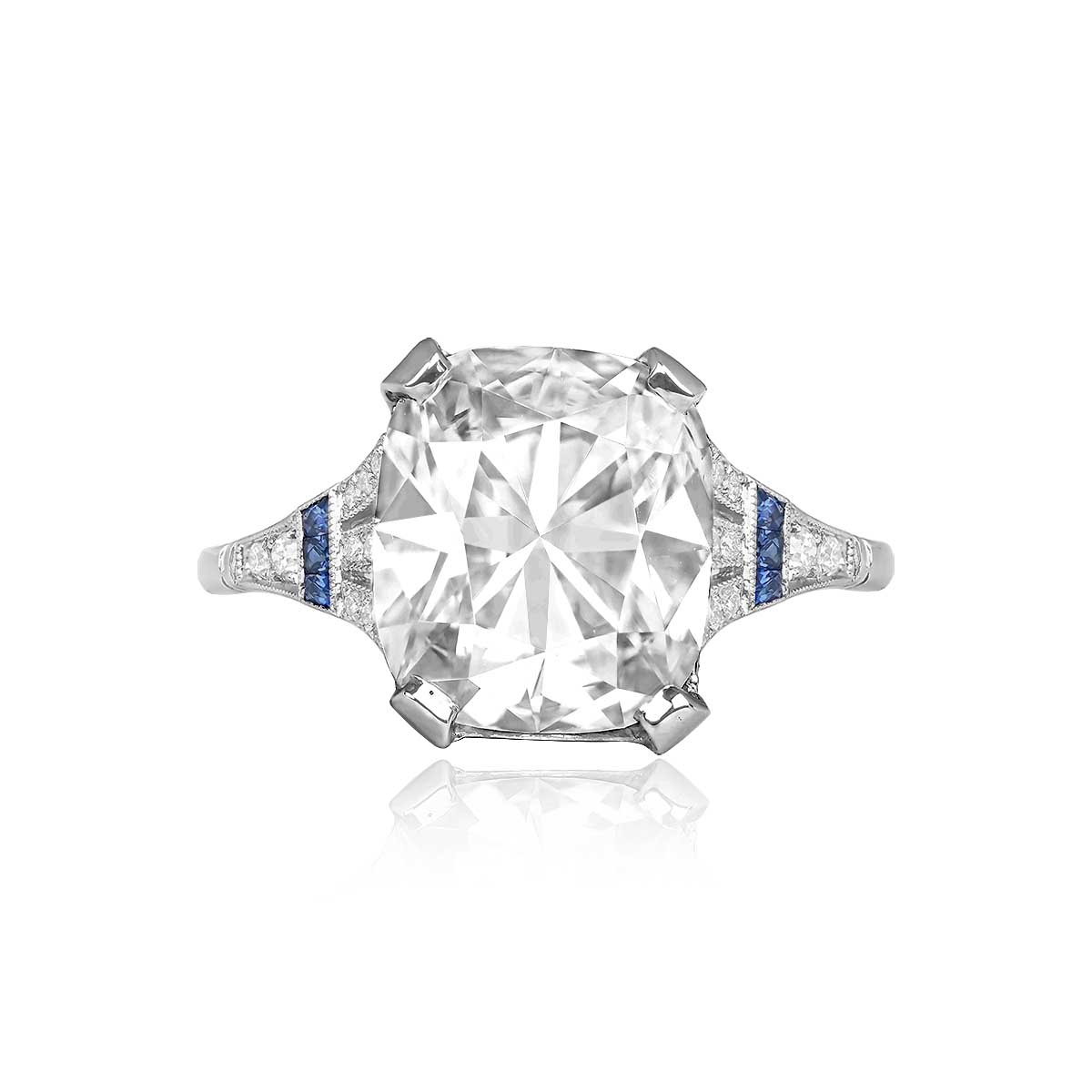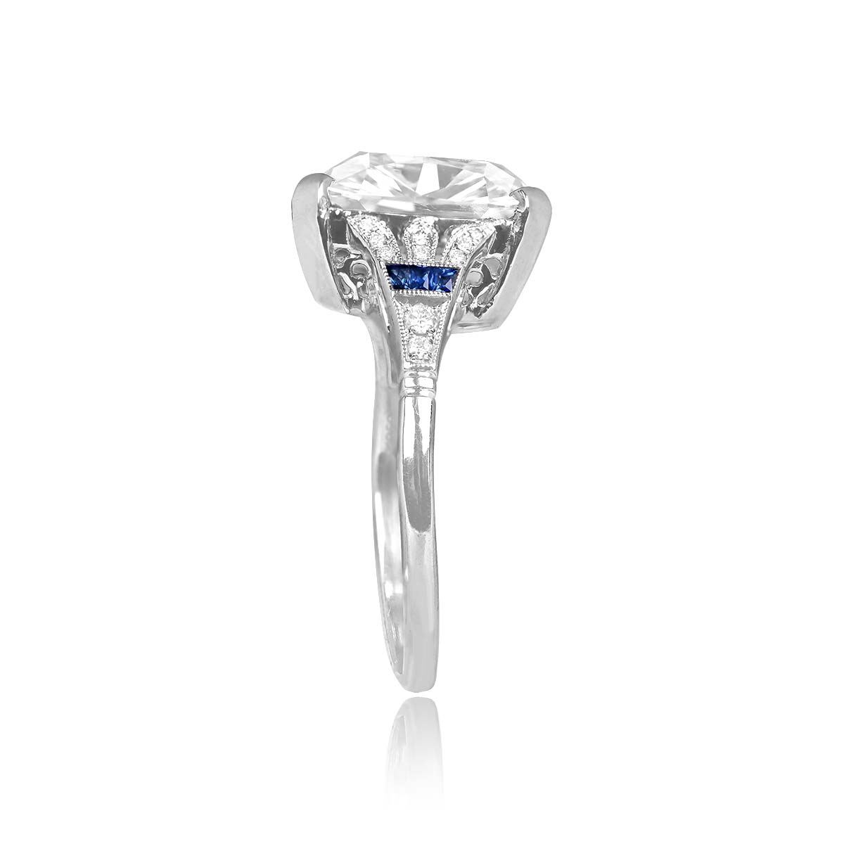 An impressive ring centering a 5.15 carat elongated cushion-cut diamond, J color, and VS1 clarity. The center diamond is set in prongs and is accented by old European cut diamonds and sapphires on the shoulders. Fine milgrain and an openwork under-gallery adorn the shank. This ring is handcrafted in platinum.