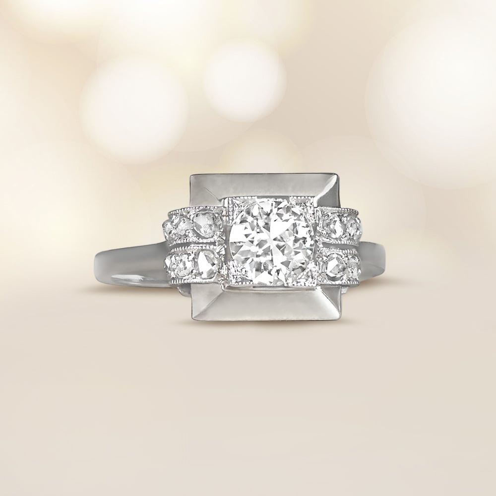 A geometric platinum engagement ring that features a 0.60 carat old European cut diamond, K color and SI2 clarity, in a box prong setting. The center diamond is flanked by two rows of rose-cut diamonds on each side, pave-set in an east-west orientation. Fine milgrain adorns the mounting. This ring is vintage from the Retro era, circa 1940.