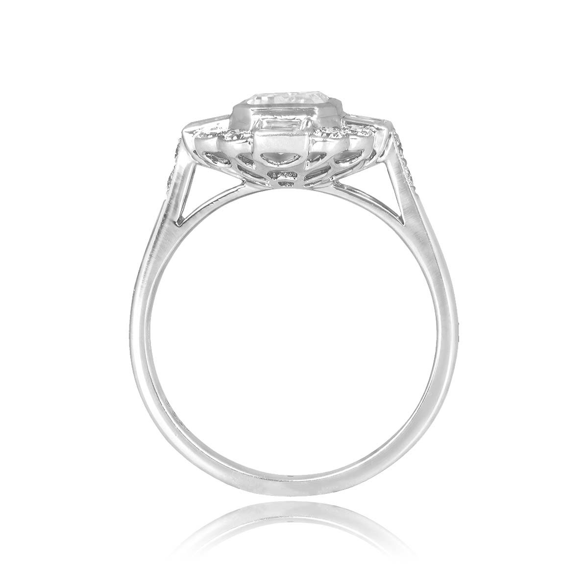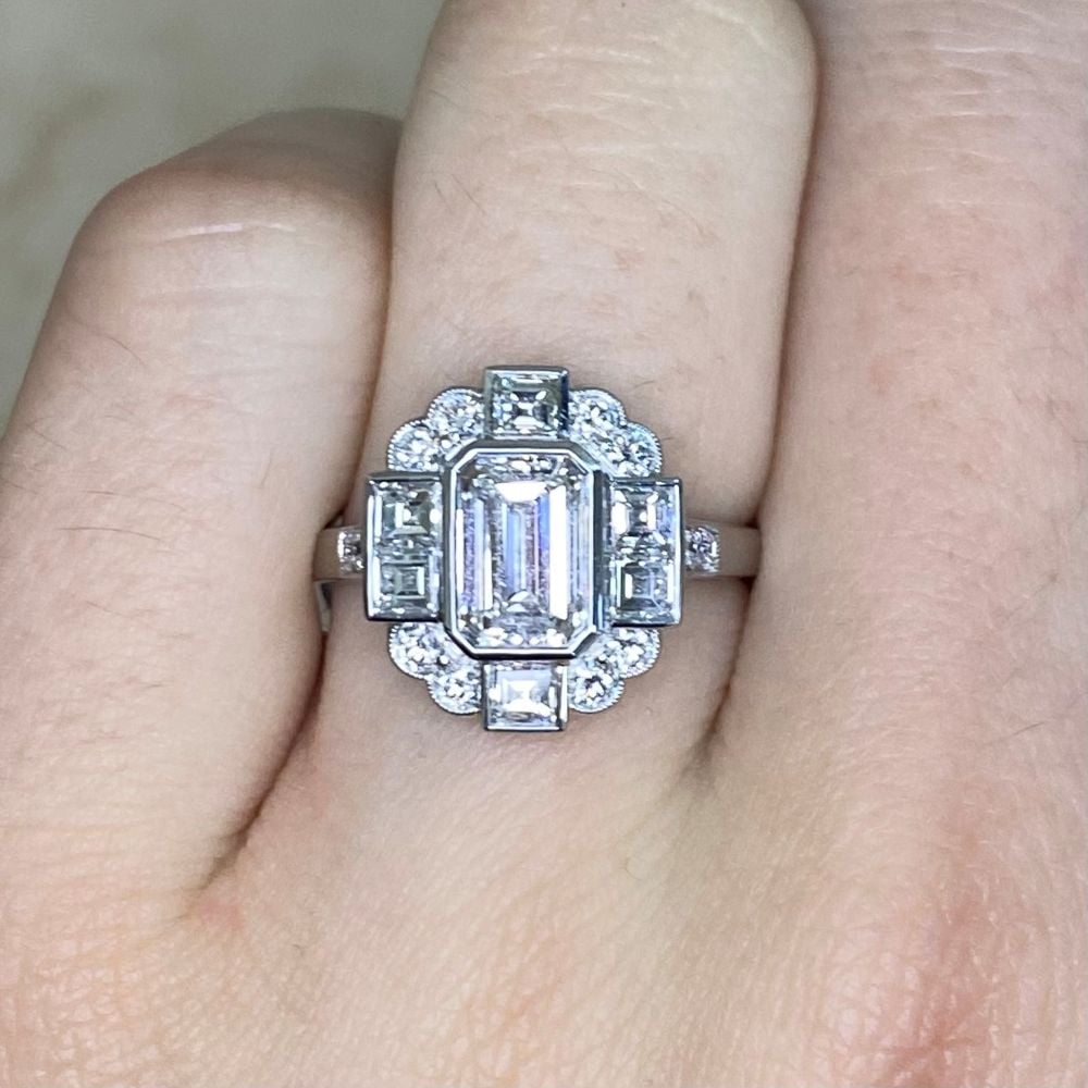 A Word from the Jeweler: The emerald cut center diamond framed by a mixed shape diamond halo creates such a striking geometric pattern that I really admire. I also appreciate how the platinum setting gives it both durability and a refined finish.