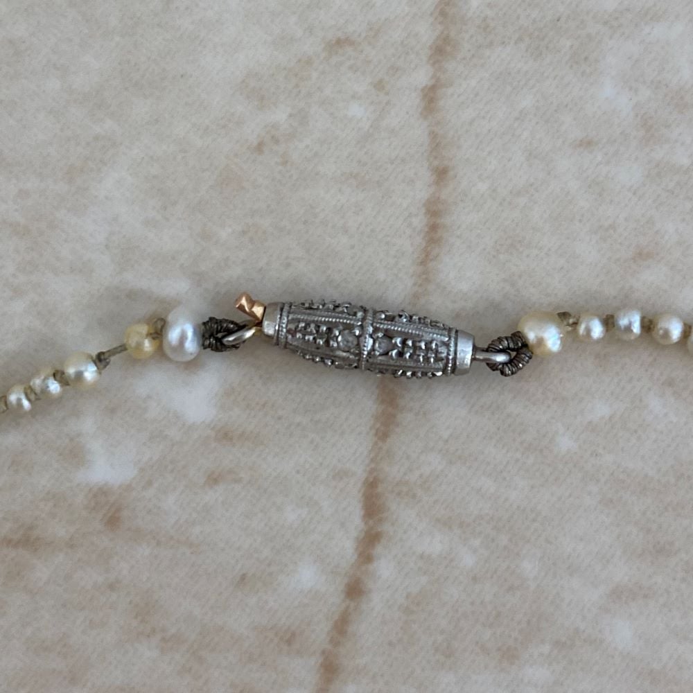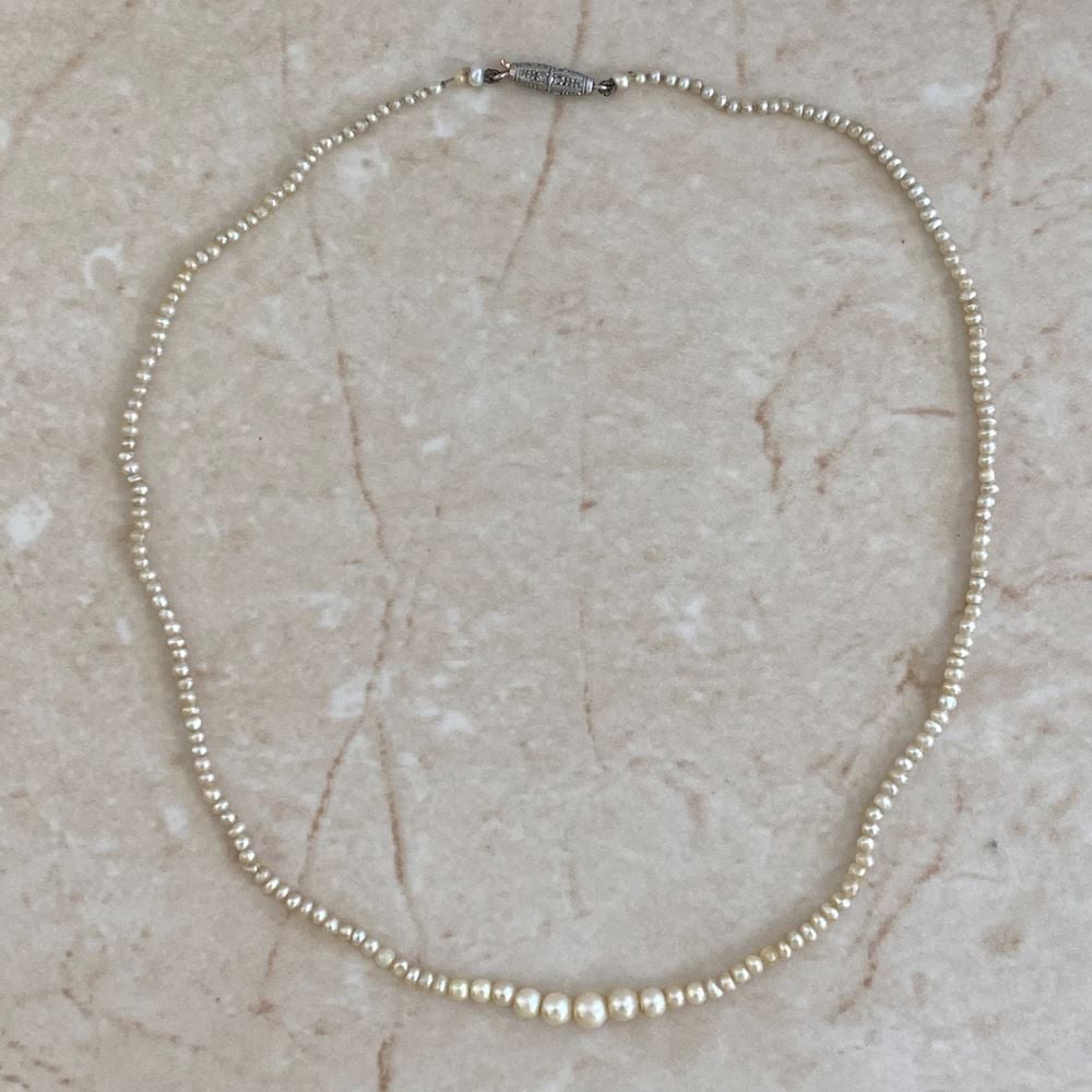 An elegant necklace set with a strand of natural saltwater pearls. The pearls are connected by a clasp crafted from platinum and 18k yellow gold.