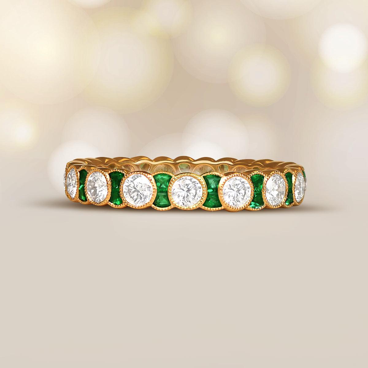 A stunning eternity band featuring round brilliant cut diamonds and calibre green emeralds. This band is handcrafted in 18k yellow gold. The diamonds and green emeralds are bezel set and decorated with fine milgrain.