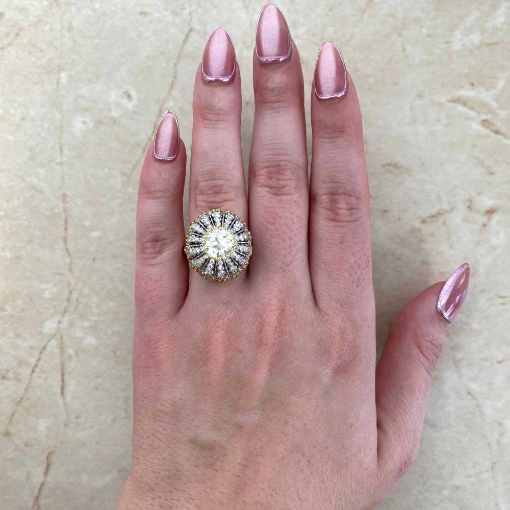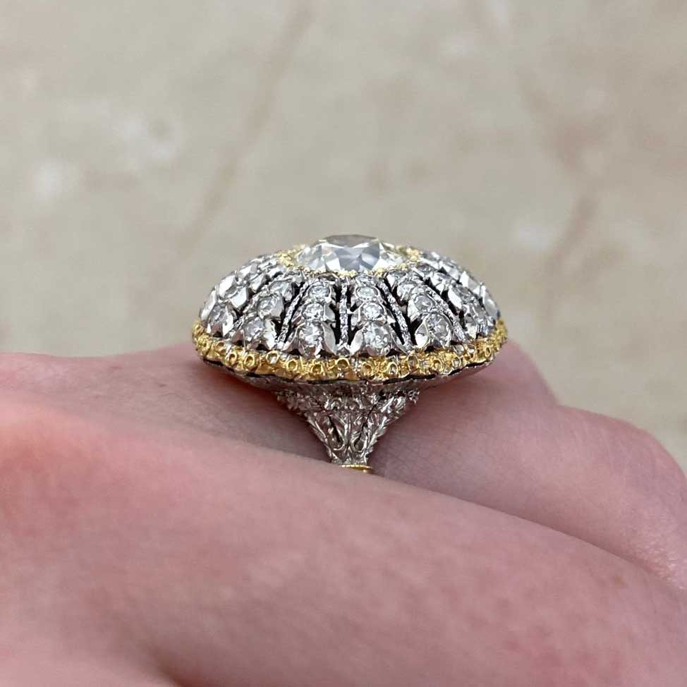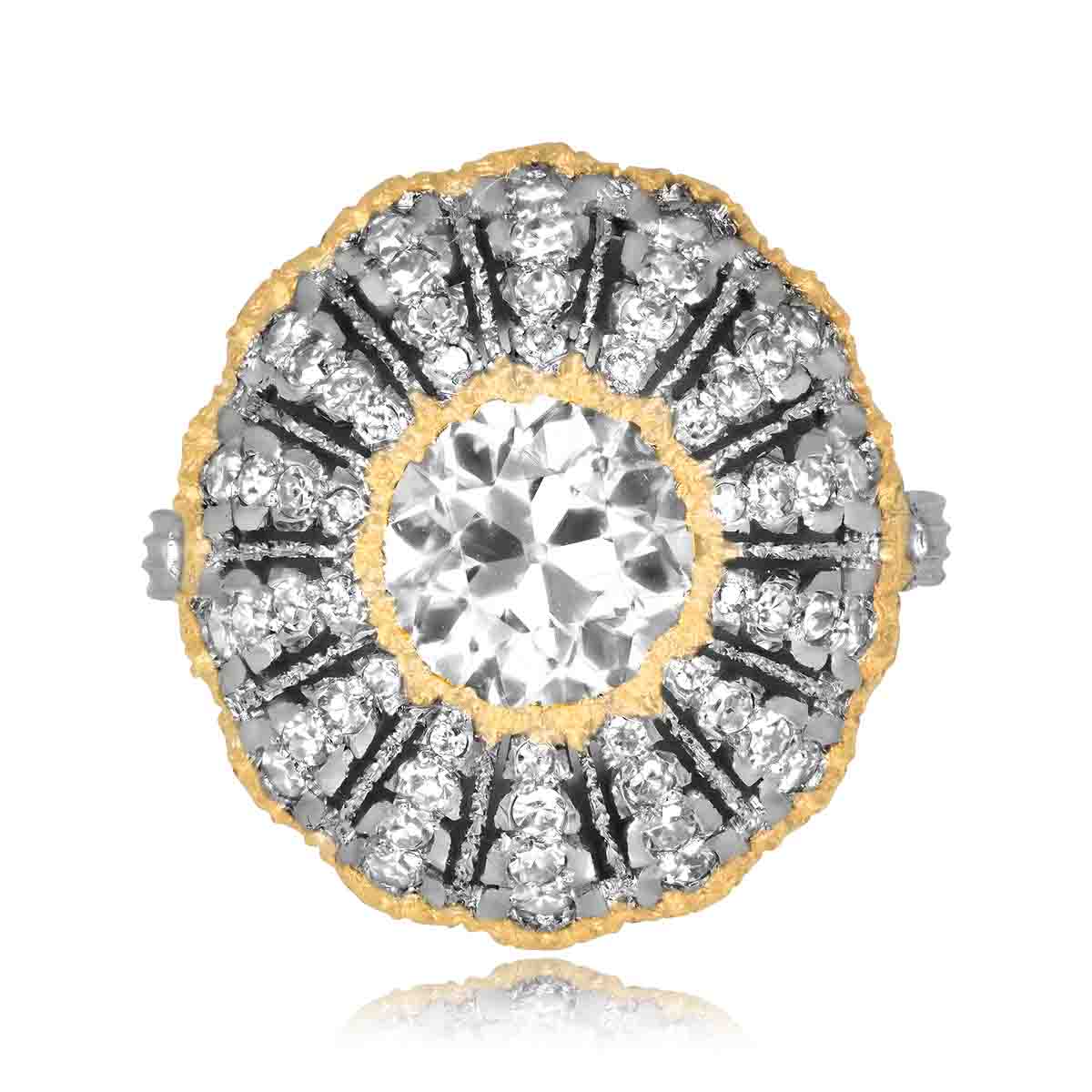 A beautiful Buccellati ring centering a 2.01-carat old European cut diamond, J color, and VS1 clarity. The center diamond is accented by yellow gold. Rows of single-cut diamonds set in a starburst design decorate the openwork mounting. Yellow gold borders the outer edge of the mounting. Hand engravings decorate the shoulders and under-gallery. This ring is handcrafted in 18k white and yellow gold and decorated with brushwork. The inside of the shank is signed BUCCELLATI.