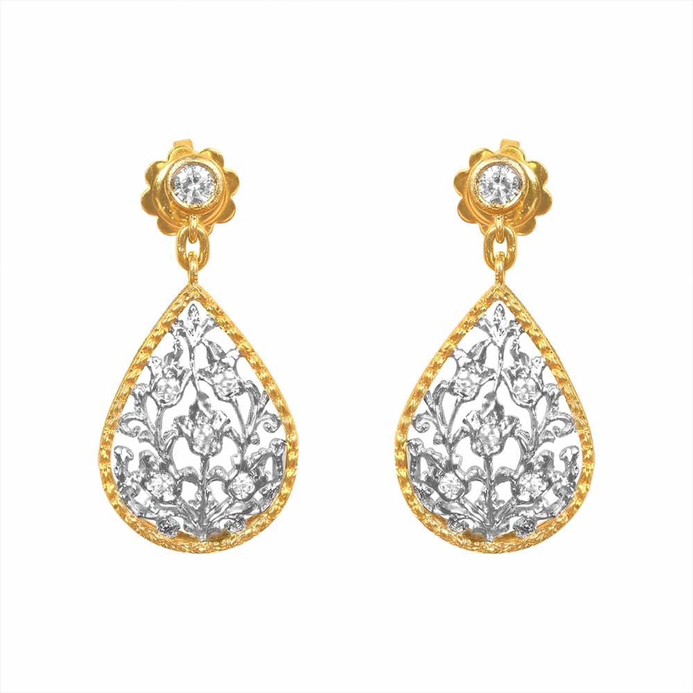 A stunning pair of Buccellati earrings in a drop shaped design. These earrings feature intricate 18k white gold floral motifs adorned with diamond details and framed by a textured 18k yellow gold rim. The top section of each earring highlights an additional prong set diamond in a bezel setting. These earrings were crafted in Italy in the early 2000s and signed Buccellati.