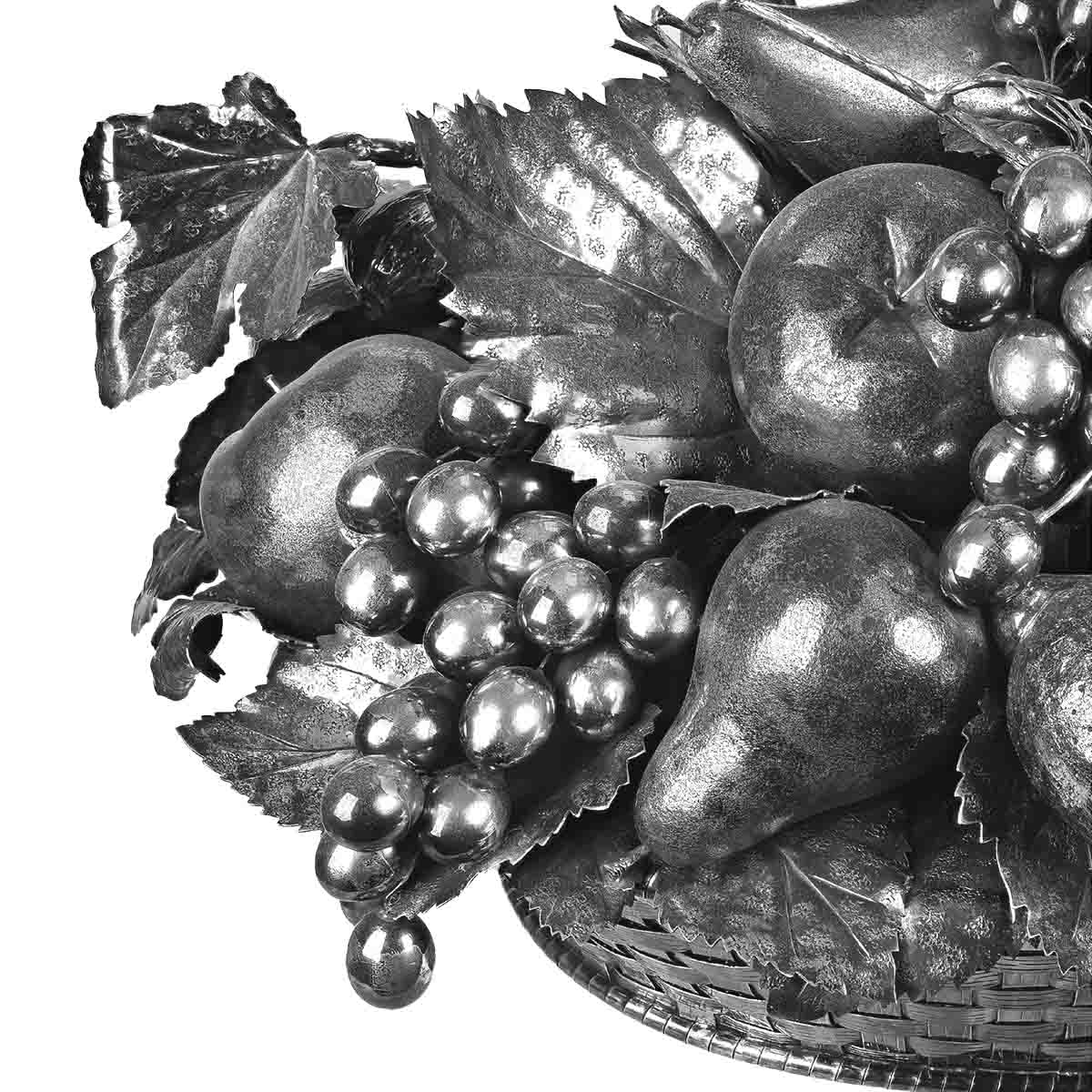 An extraordinary vintage Mario Buccellati centerpiece. Crafted entirely in sterling silver, this centerpiece is designed in a richly detailed fruit basket, brimming with a sculptural array of fruits and foliage motifs that display Buccellati’s signature texture work and lifelike detail. A concealed compartment is featured in the center of the basket. At over 20 inches in length, this is a notably large example of Buccellati silverwork. This centerpiece is signed Buccellati, circa 1970.