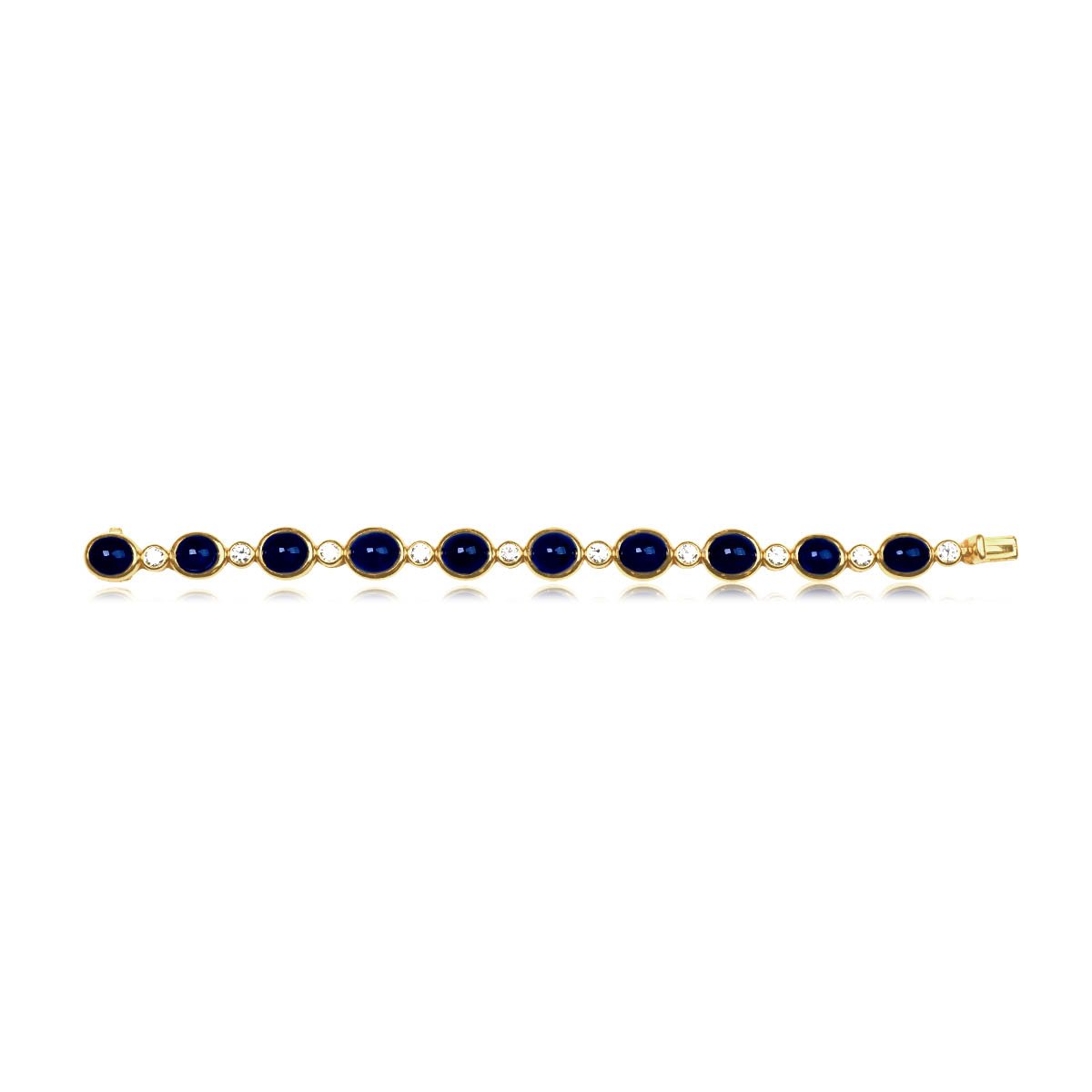 A stunning vintage Bulgari bracelet made in 18k yellow gold. This bracelet features an alternating pattern of bezel-set cabochon sapphire and round brilliant diamond stones. The sapphires weigh a total of 45.00 carats and the diamonds weigh a total of approximately 2.00 carats. This bracelet is signed Bulgari, circa 1980.