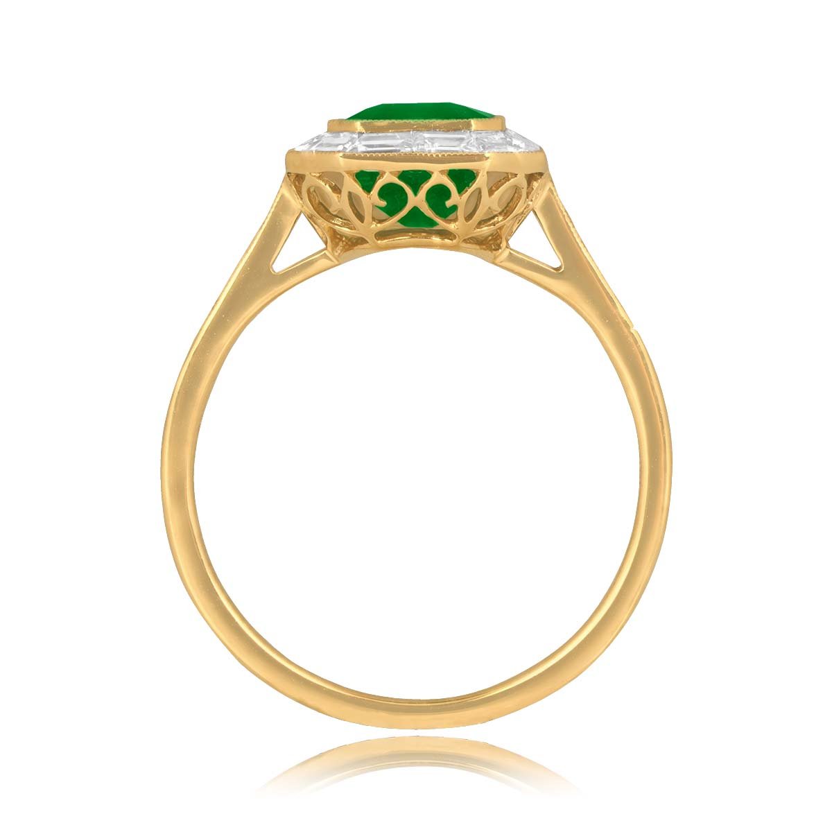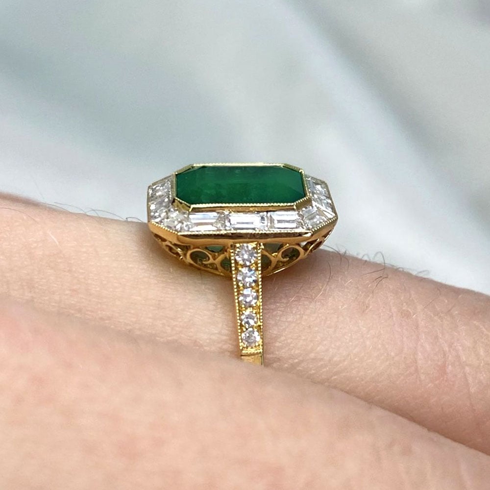 This is a unique ring that features a natural emerald-cut bezel-set emerald weighing 2.00 carats. Surrounding the center stone is a halo of baguette-cut diamonds that are channel-set and weigh approximately 0.62 carats. Adorning the shoulders are five prong-set single-cut diamonds with a total approximate weight of 0.07 carats. The under-gallery is decorated with stunning openwork filigree, and fine milgrain further accents the ring.  This ring is crafted in 18k yellow gold.