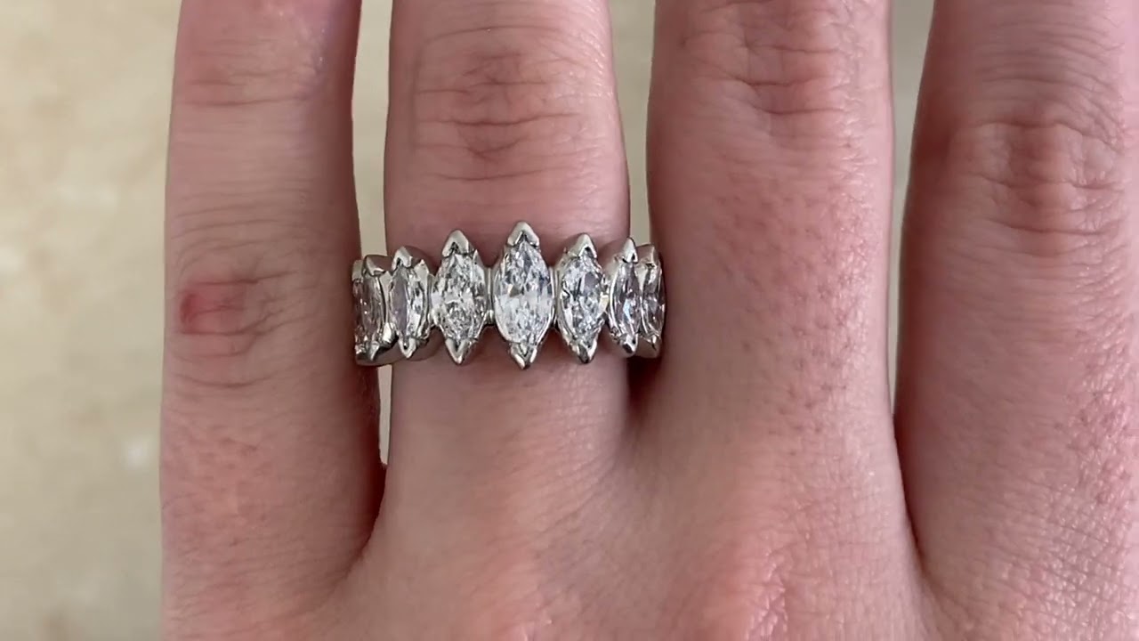 A striking wedding band featuring an eternity of marquis-cut diamonds. The diamonds are all prong-set and have a total approximate weight of 4.5 carats, H-I color, and VS2 overall clarity. The diamonds are arranged in a graduating pattern, shifting from larger to smaller stones. The band is mounted in platinum.