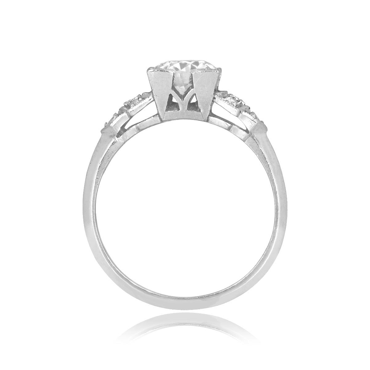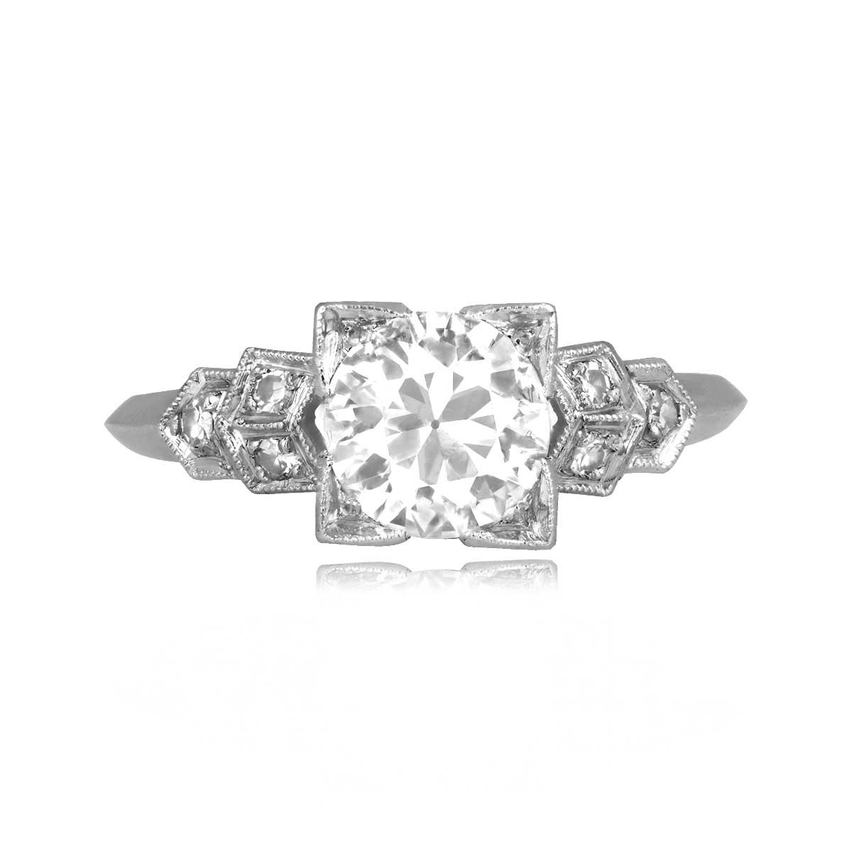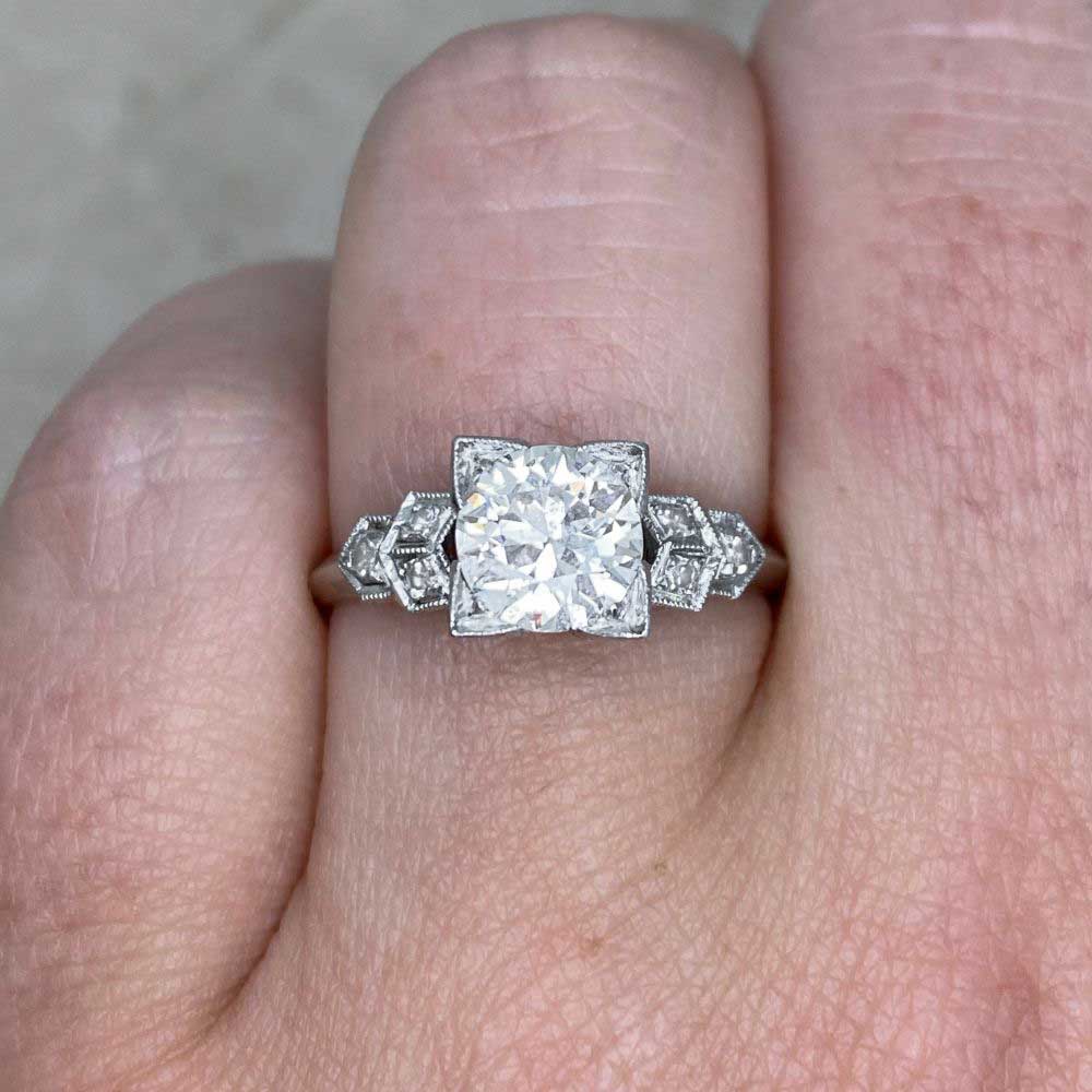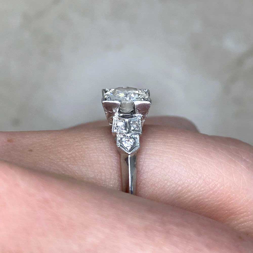 A beautiful Art Deco ring centering a square-prong set old European cut diamonds weighing approximately 0.90 carats with a J color and VS1 clarity. The shoulders are decorated with a geometric pattern featuring additional diamonds and milgrain detailing. The total additional diamonds weigh approximately 0.12 carats. This ring was handcrafted in platinum, circa 1920.