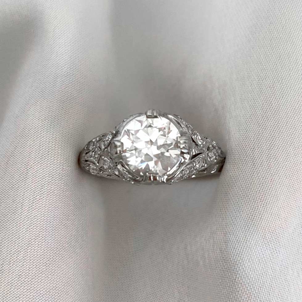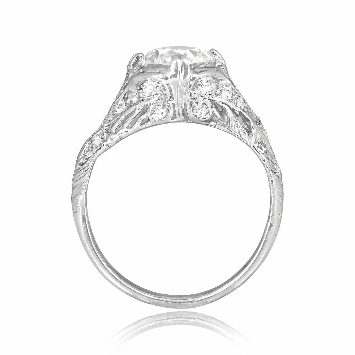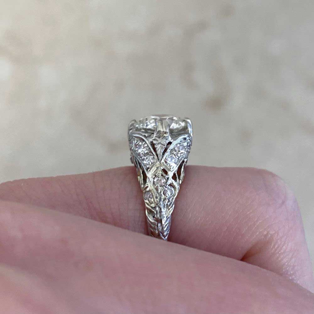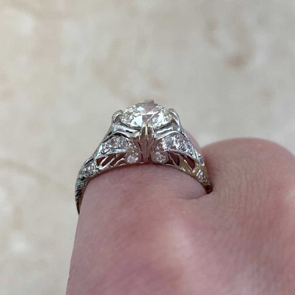 This beautiful Art Deco ring features a 1.20 carat Old European cut diamond, J color and VS1 clarity, set in prongs. A detailed open work filigree highlighting antique single cut diamonds, decorates the under-gallery and shoulders of this ring. This ring is handcrafted in platinum and 14k yellow gold, circa 1925.