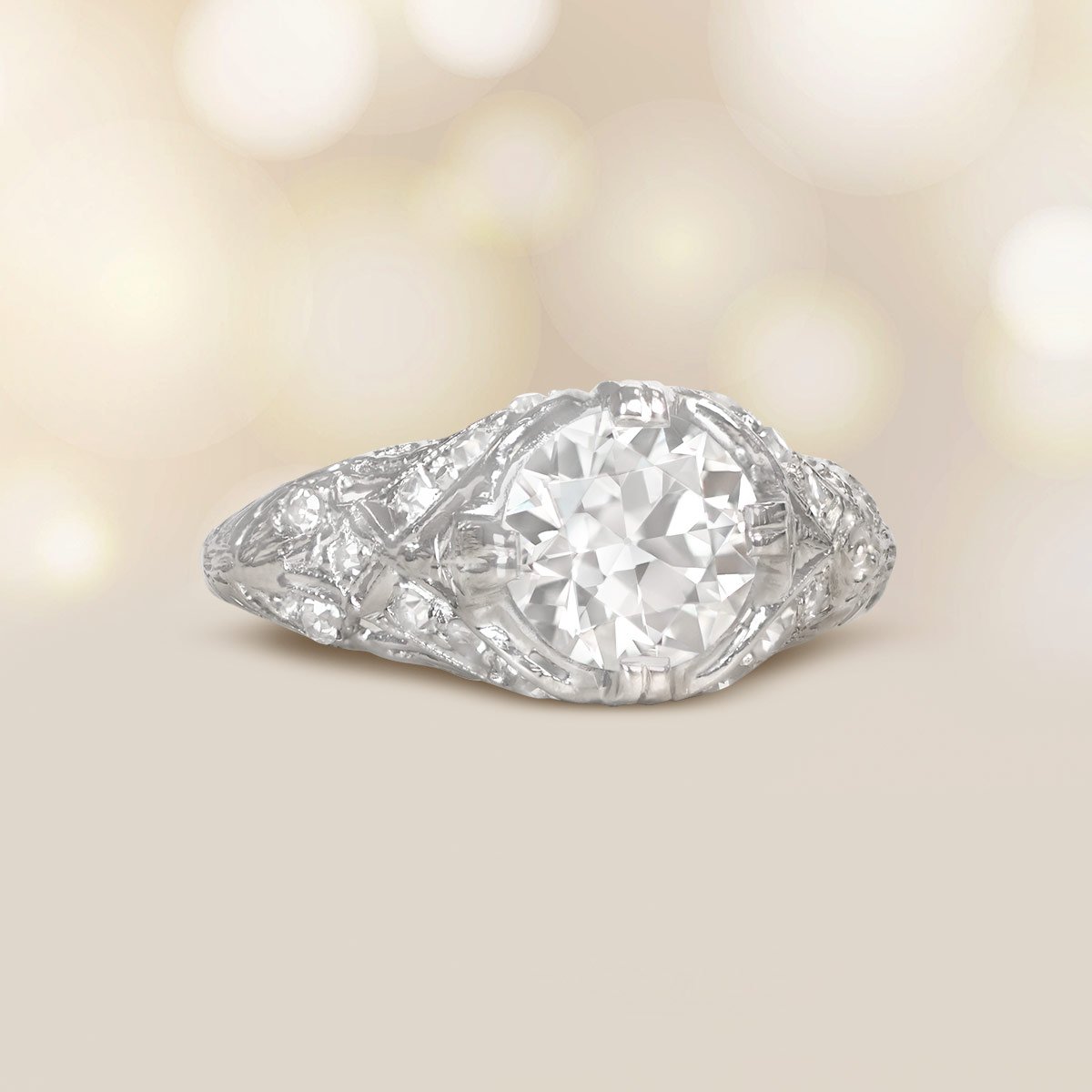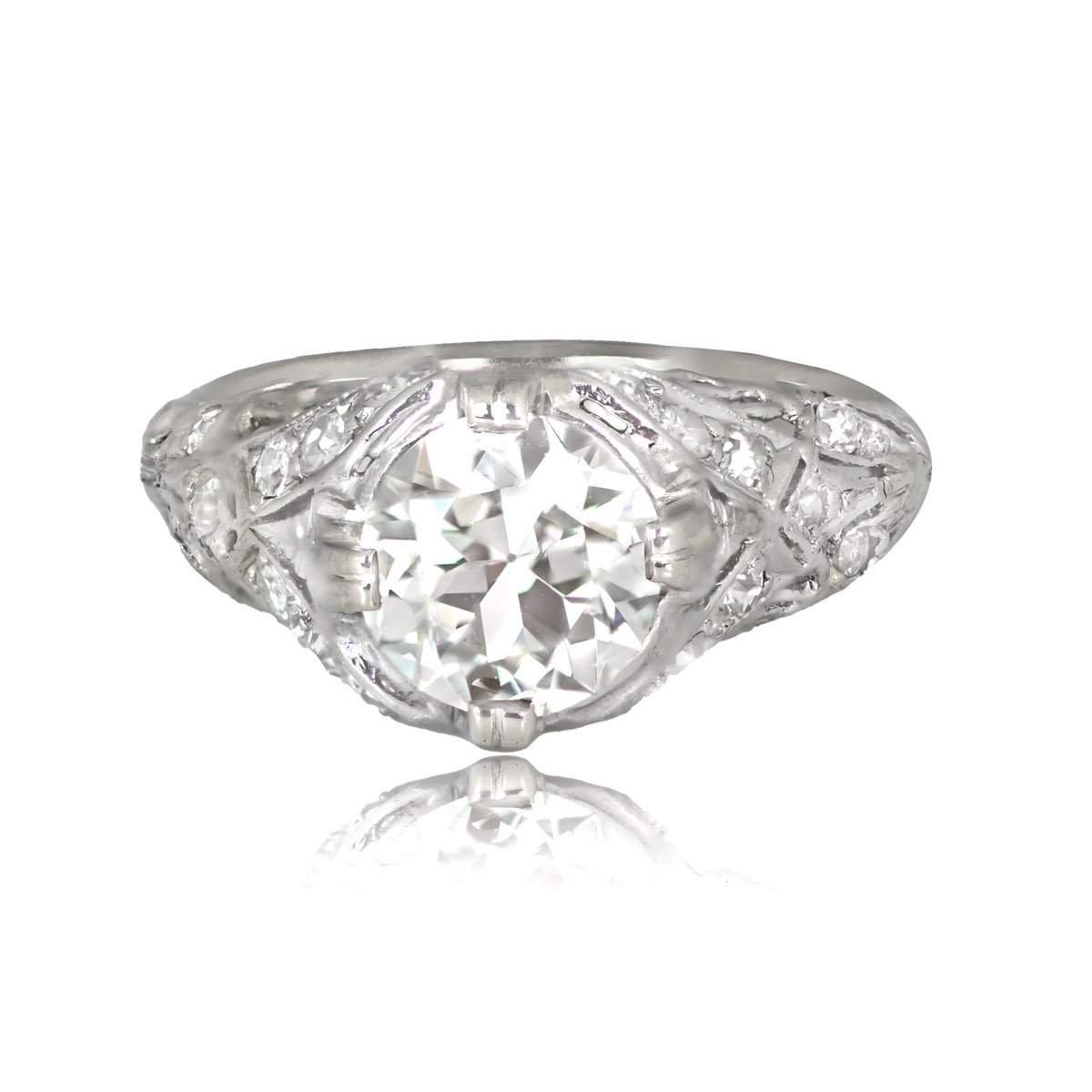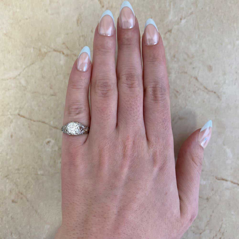 This beautiful Art Deco ring features a 1.20 carat Old European cut diamond, J color and VS1 clarity, set in prongs. A detailed open work filigree highlighting antique single cut diamonds, decorates the under-gallery and shoulders of this ring. This ring is handcrafted in platinum and 14k yellow gold, circa 1925.